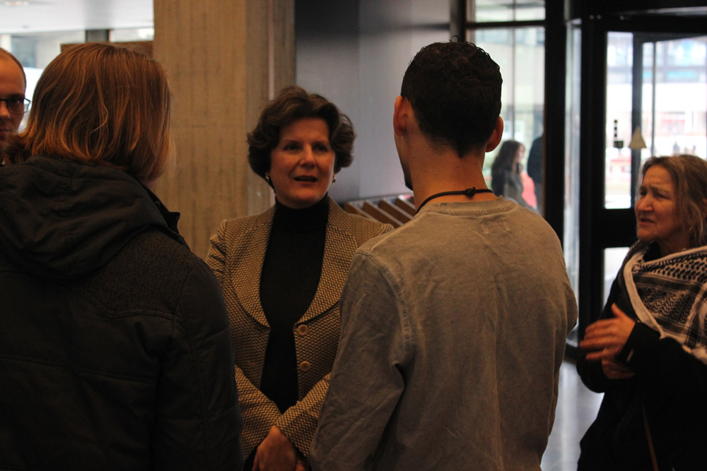Collegevoorzitter Pauline van der Meer Mohr luistert geduldig naar de studenten. “Fijn dat er studenten zijn die zich niet generen om problemen aan te kaarten”, zegt ze na afloop. “Vanuit hun perspectief begrijp ik heel goed dat ze zich zorgen maken. Ik snap dat de noodzaak van reorganisaties bijvoorbeeld niet duidelijk is. Ik heb natuurlijk een ander perspectief, want ik weet wat er speelt en praat mee over de reorganisaties.”