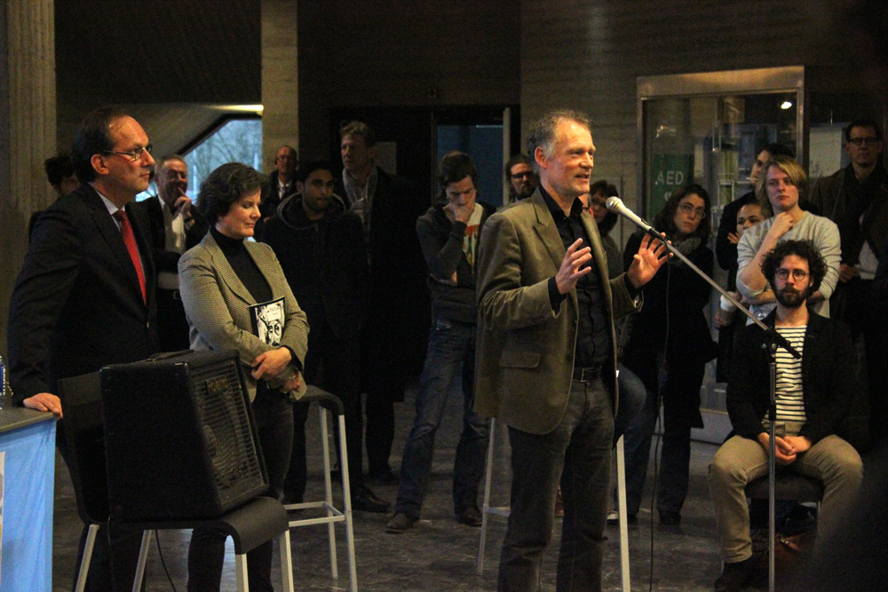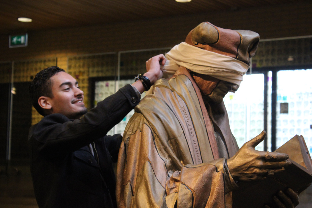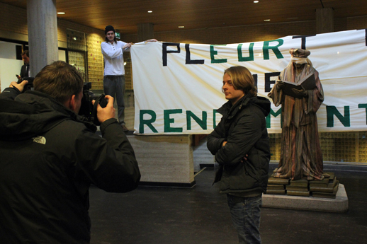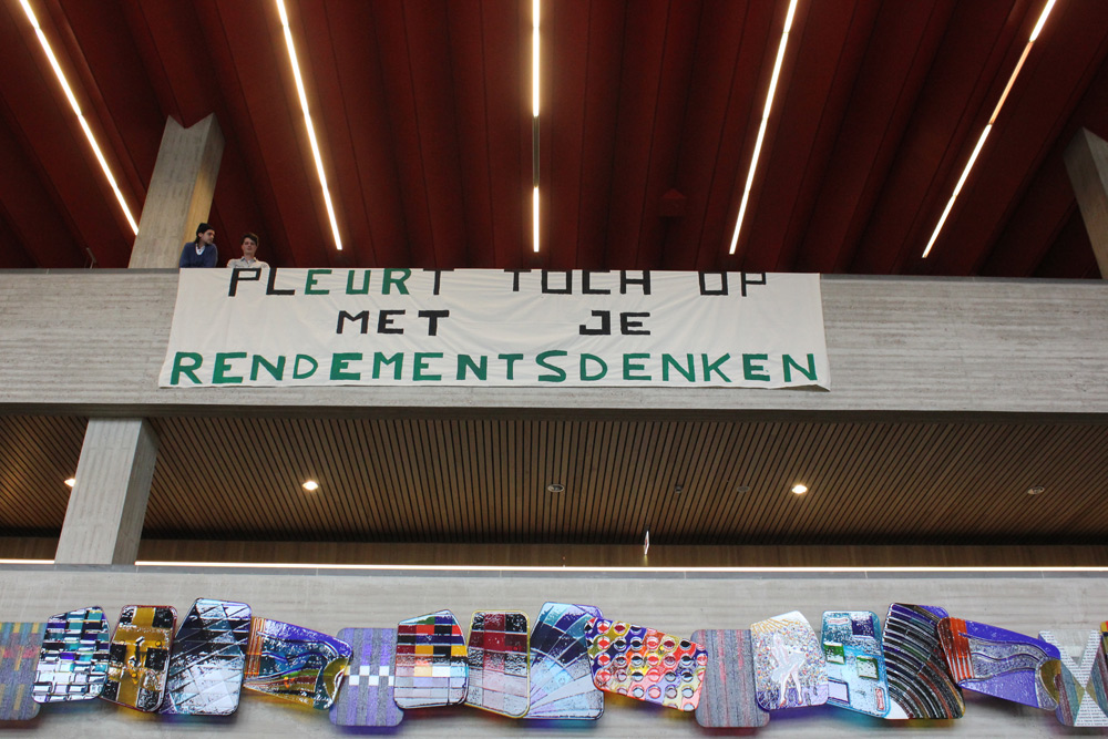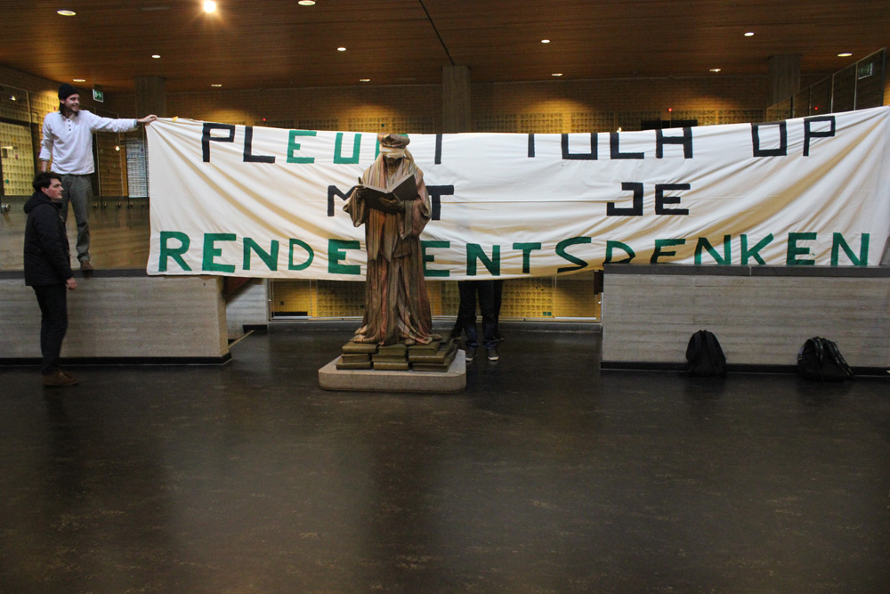 De Nieuwe Universiteit Rotterdam heeft inmiddels ook een gezicht. Tweedejaars sociologiestudent Bob Scholte voert het woord. “Wij zijn hier om gehoor te geven aan de landelijke actiedag en verklaren ons solidair met de actievoerders in het Maagdenhuis”, speecht Scholte. Enkele minuten eerder hebben ze een groot spandoek met ‘pleurt toch op met je rendementsdenken’ opgehangen, en — zoals beloofd — het Erasmusbeeld bij de aula een blinddoek voor gehangen.