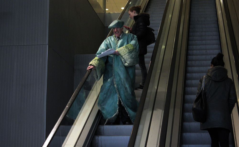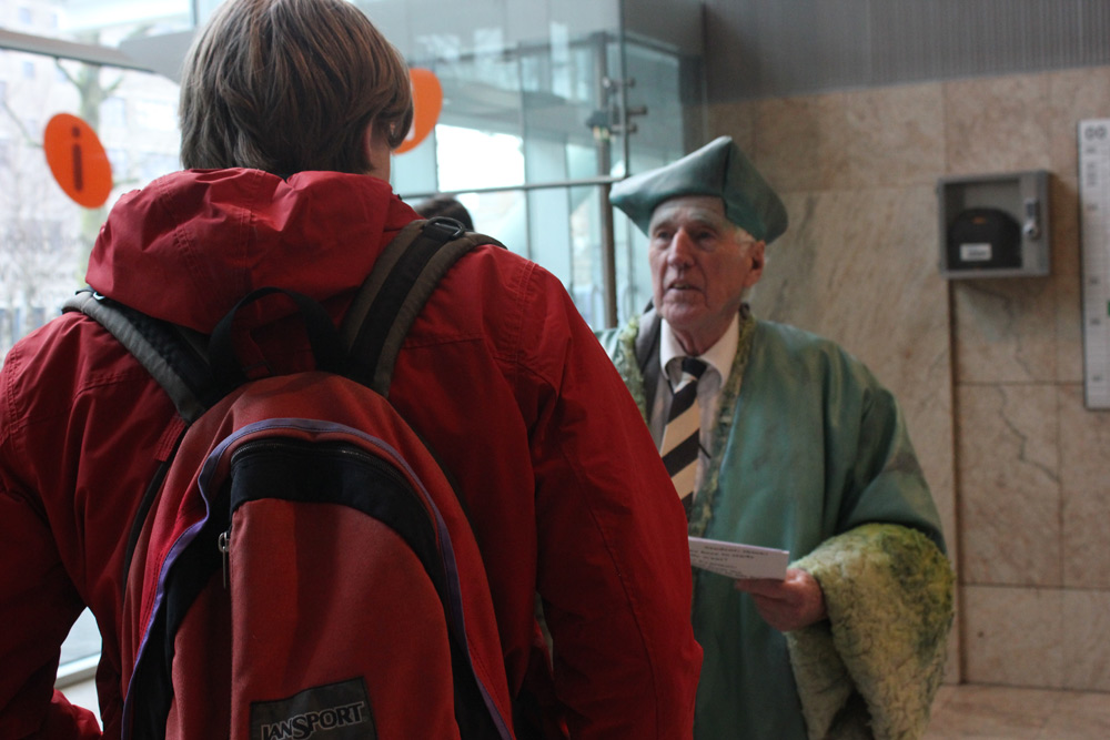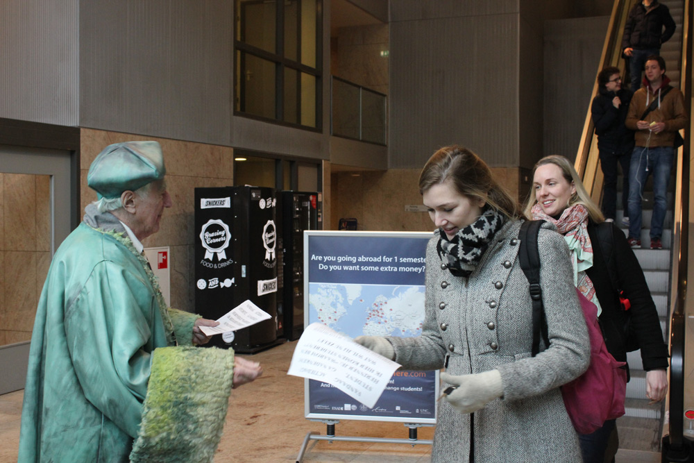 En inderdaad, woensdagochtend deelt Verbrugh, met groene schmink op zijn voorhoofd, flyers uit. VANDAAG ACTIEDAG! STUDENT, GA NADENKEN! HERINNER JE: “WAAROM BEN IK HIER KOMEN STUDEREN?”, staat erop. Op de achterzijde zijn brief uit het NRC van de vorige dag. De 77-jarige Verbrugh is tevreden met zijn actie. Nog voor de lunch is hij al driehonderd flyers kwijt. “Een enkeling loopt glazig door, maar de meesten kijken je toch wel even aan en met sommigen sta je wel een kwartier te praten.”