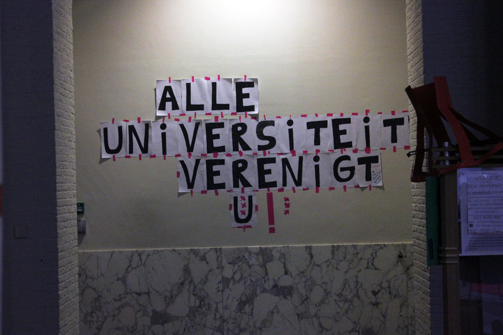Ondertussen verzamelen de studenten die zich De Nieuwe Universiteit Rotterdam noemen in de C-hal. Ze zijn met een man of 25, en er is veel pers. Het blijken voornamelijk sociologiestudenten te zijn. Een aantal van hen is verbonden aan ROOD, de jongerenafdeling van de SP. “Dat klopt, maar daar willen we ons niet mee associëren”, zegt de 20-jarige Laura den Ouden, student Sociologie en Wijsbegeerte van een Wetenschapsgebied. Den Ouden heeft vorige week drie nachten in het Maagdenhuis geslapen en raakte geïnspireerd door de lezingen en inhoudelijke gesprekken over democratie op universiteiten. Een bezetting zoals daar ziet ze voorlopig niet zitten. “We willen niet direct in de aanval, eerst maar eens in gesprek met het College van Bestuur.”