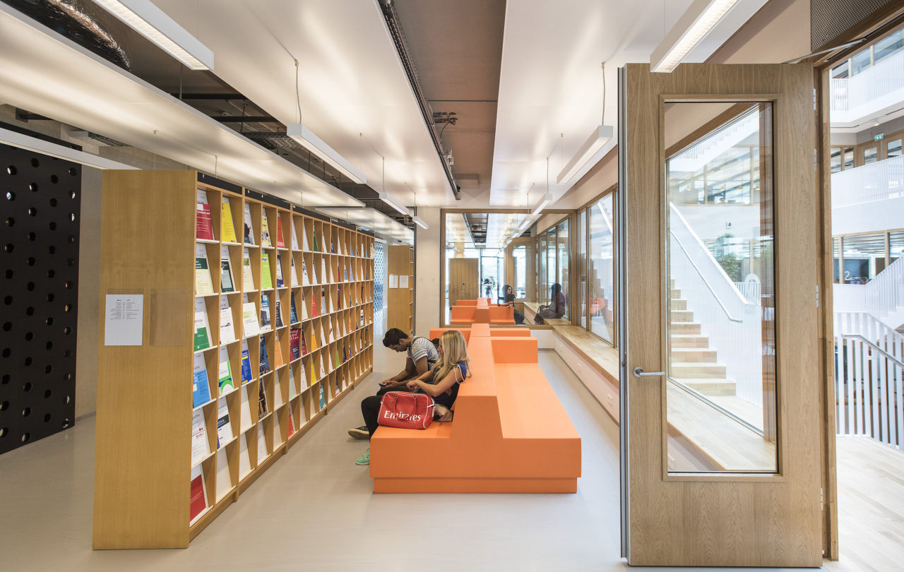 Behalve trappen bieden de openbare ruimtes van de nieuwe campusaanwinst ook loungehoekjes, bankjes en zelfs zitzakken. Het ontwerp is volgens de architecten van bureau Paul de Ruiter een ‘flexibele structuur’. Binnen en buiten lopen zoveel mogelijk in elkaar over. Van onderaan de grote houten trap, die ook als zittribune gebruikt kan worden, kijk je rechtstreeks naar het platte dak van het gebouw, lichtgevende vierkanten met daarop zonnecollectoren.