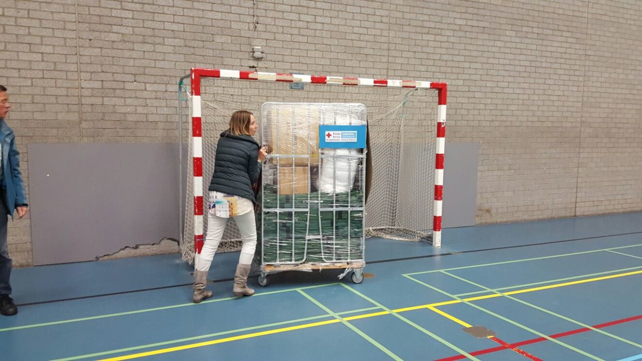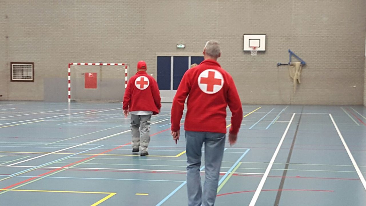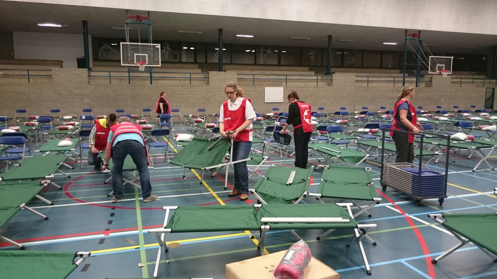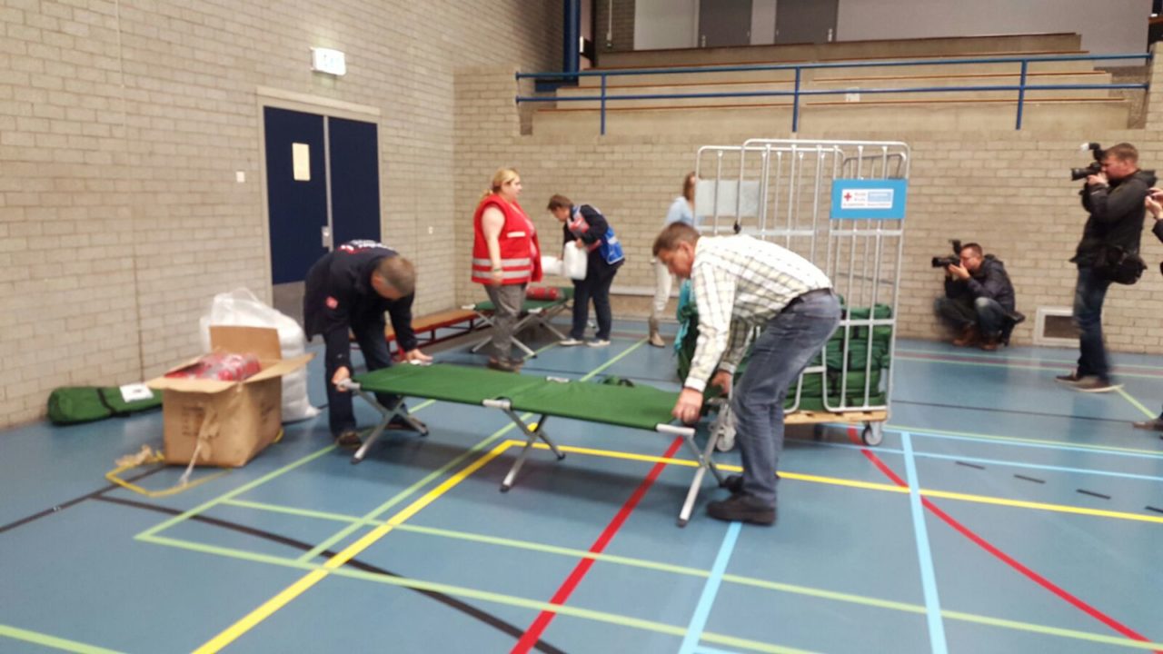 18.47: De eerste bedden worden binnen gebracht door het Rode Kruis en uitgeklapt in de zaal.