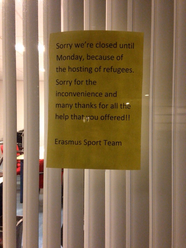 “Op verzoek van burgemeester Aboutaleb worden mogelijk vanaf vanavond of morgenochtend maximaal 250 vluchtelingen opgevangen in het sportgebouw op campus Woudestein. Het is nog niet duidelijk hoe lang het sportgebouw als noodopvang gebruikt gaat worden. Op dit moment wordt overleg gevoerd met de gemeente en het COA hoe de opvang geregeld gaat worden. Zodra meer bekend is zullen wij studenten en medewerkers verder informeren.”