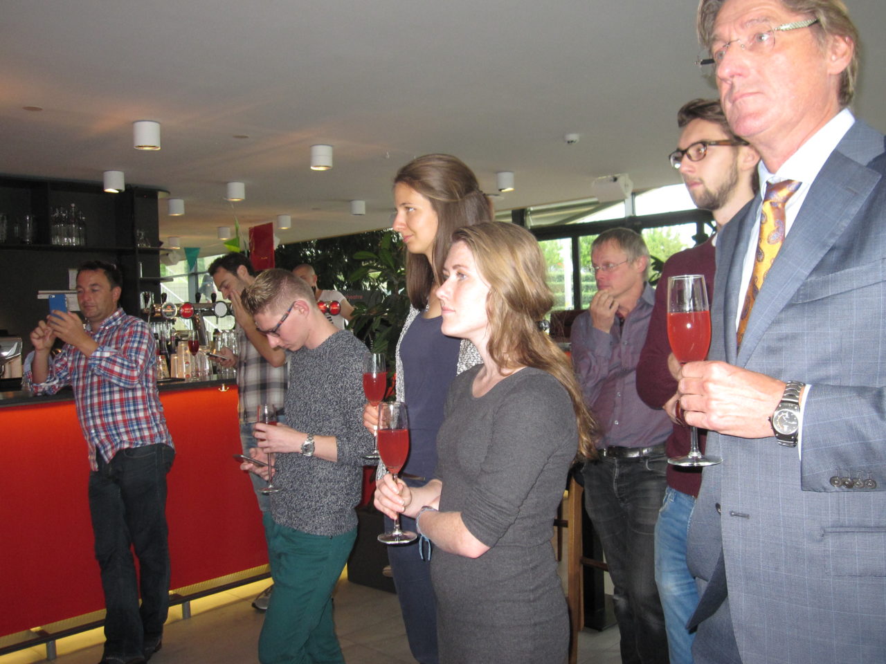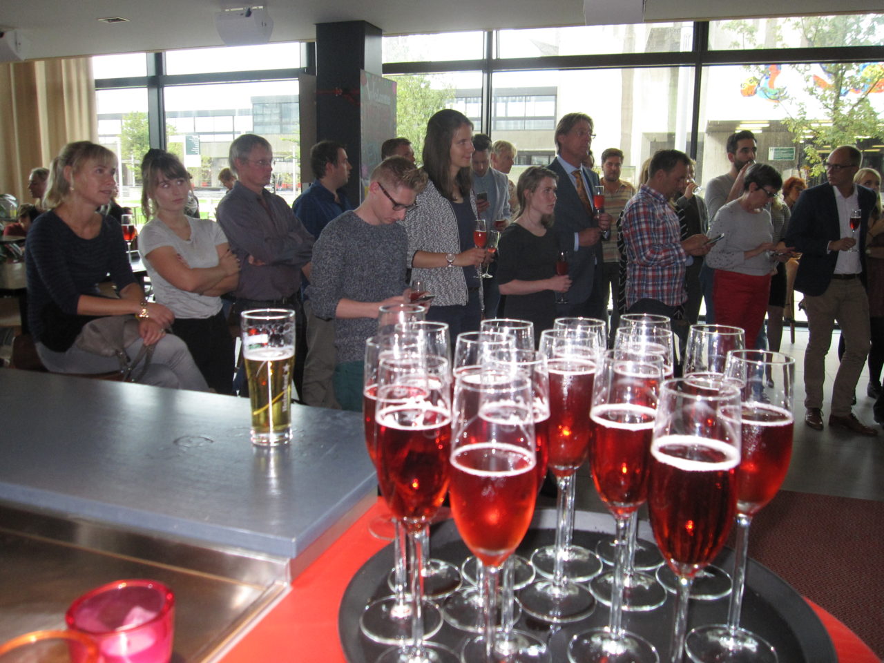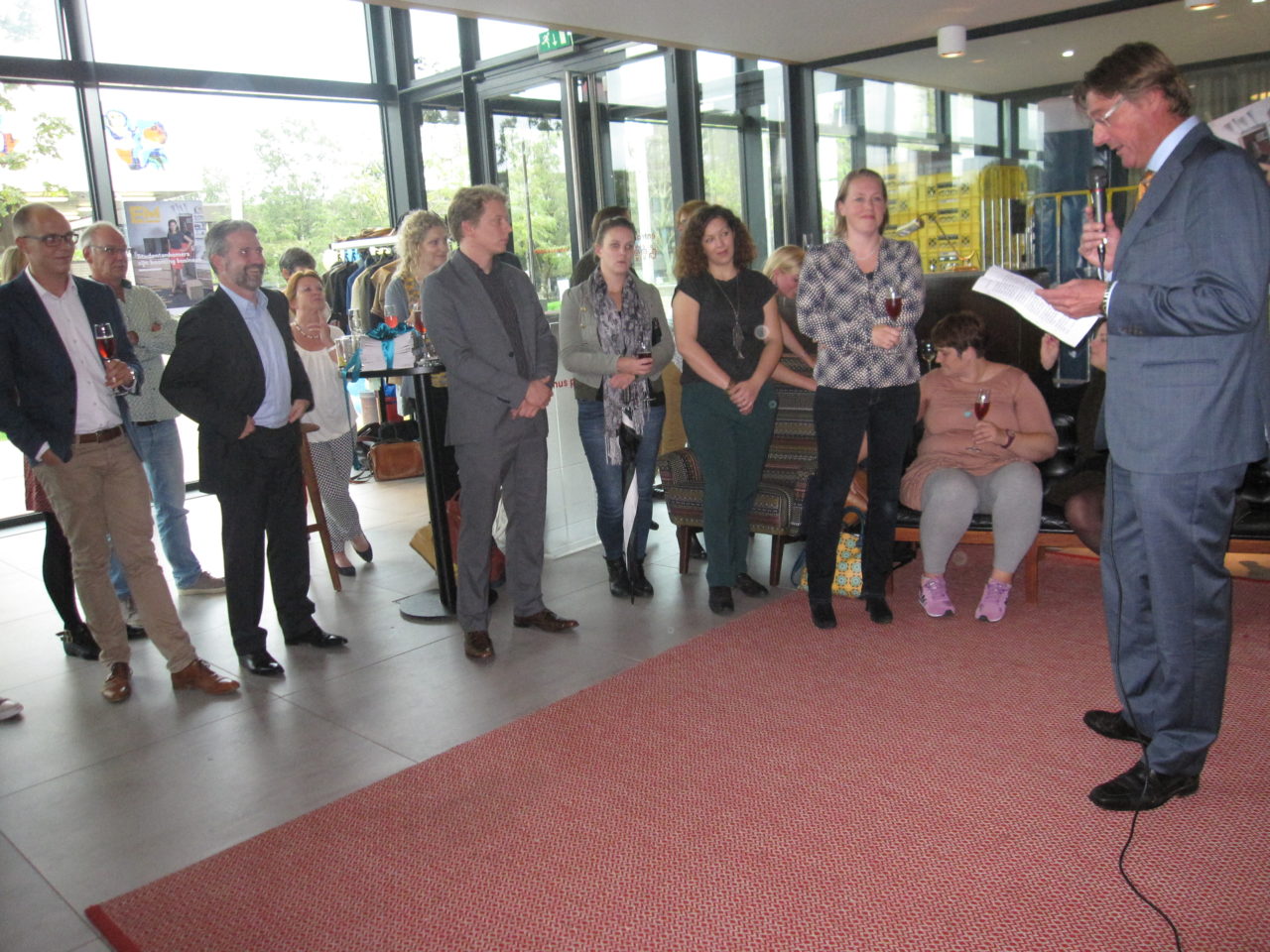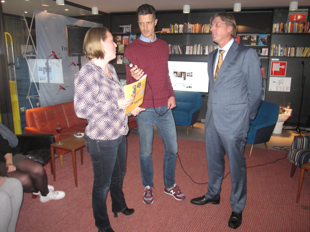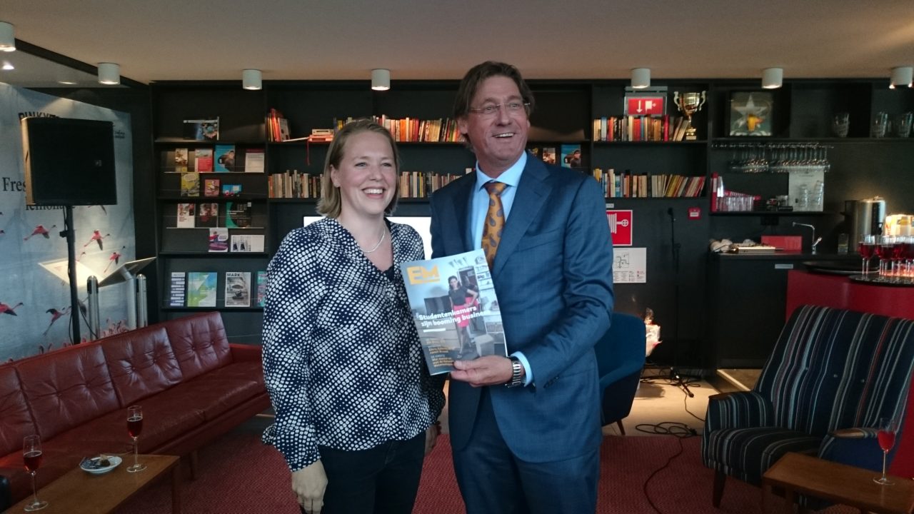 Collegelid Bart Straatman heeft woensdagavond het eerste exemplaar van Erasmus Magazine nieuwe stijl in ontvangst genomen. Hij kreeg het blad uit handen van hoofdredacteur Wieneke Gunneweg.