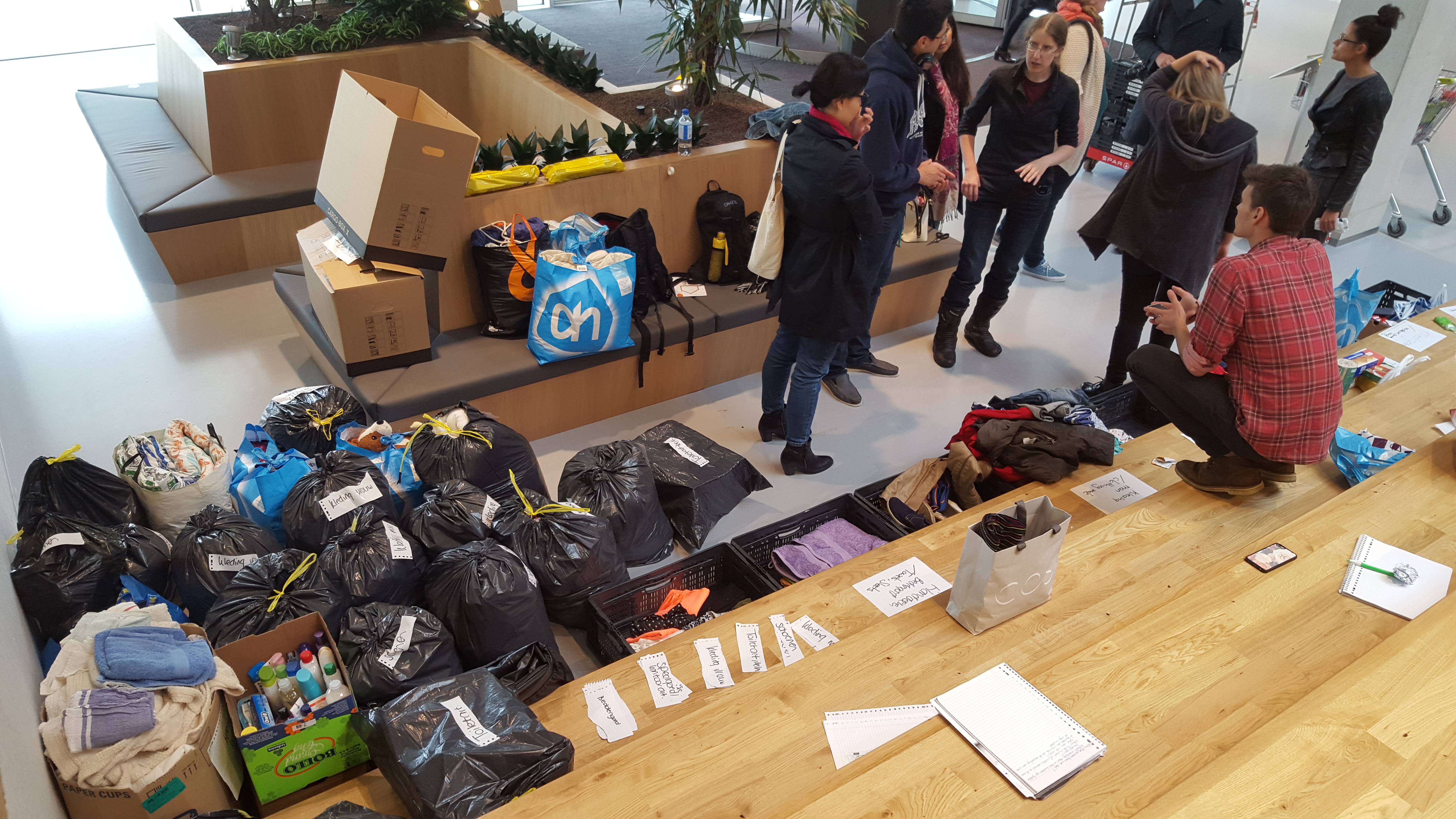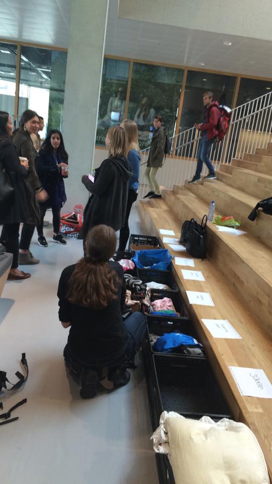 12.39: Het is druk bij de studenten die spullen inzamelen in het Polakgebouw. In het eerste halfuur zijn er al veertig tot vijftig studenten iets komen brengen, schat initiatiefnemer en psychologiestudent Alissa Hoogenboezem. De stapel tassen en dozen groeit gestaag. “Maar we zijn nog wel hard op zoek naar een busje om alles vanmiddag naar het Leger des Heils te brengen”, zegt Alissa.