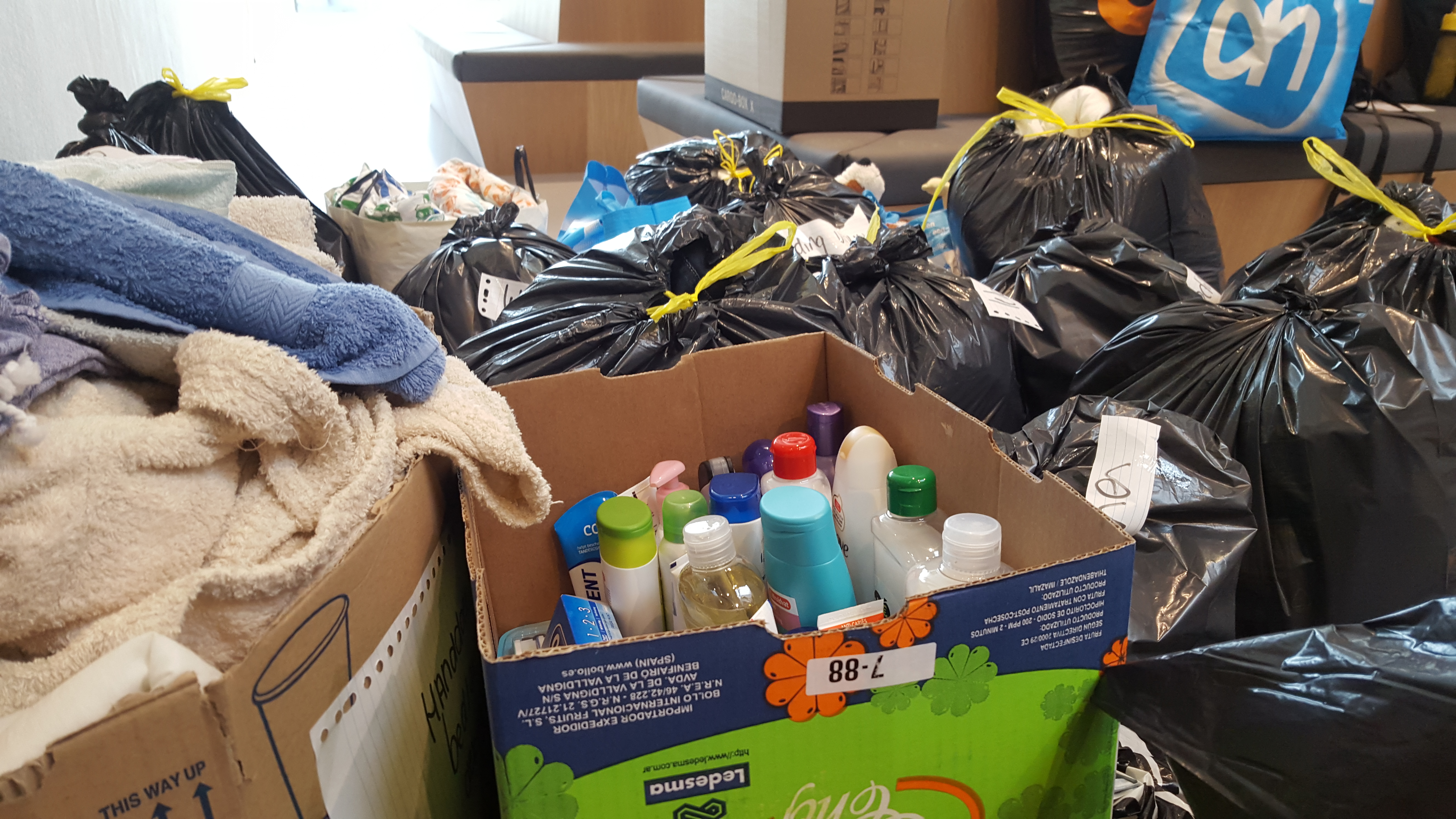 15.28 Alissa Hoogenboezem is erg blij met het resultaat van de inzamelingsactie die zij vannacht samen met wat vrienden op touw zette. Uit alle hoeken en gaten komen studenten onder andere kleding, toiletspullen en medicijnen brengen. “Er komen zoveel mensen langs. Sommige studenten zagen ons staan en zijn omgedraaid om nog nieuwe spullen te kopen”, aldus Hoogenboezem. Ook organisaties schieten te hulp. Zo kreeg Hoogenboezem van de SPAR kratten om alles op te bergen en stelde studievereniging Cedo Nulli haar kantoor beschikbaar om alles op slaan.