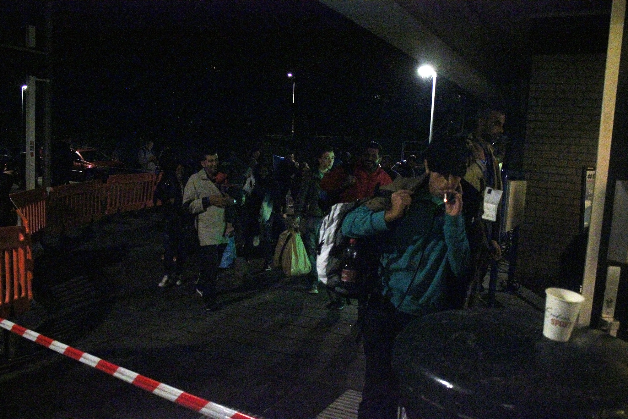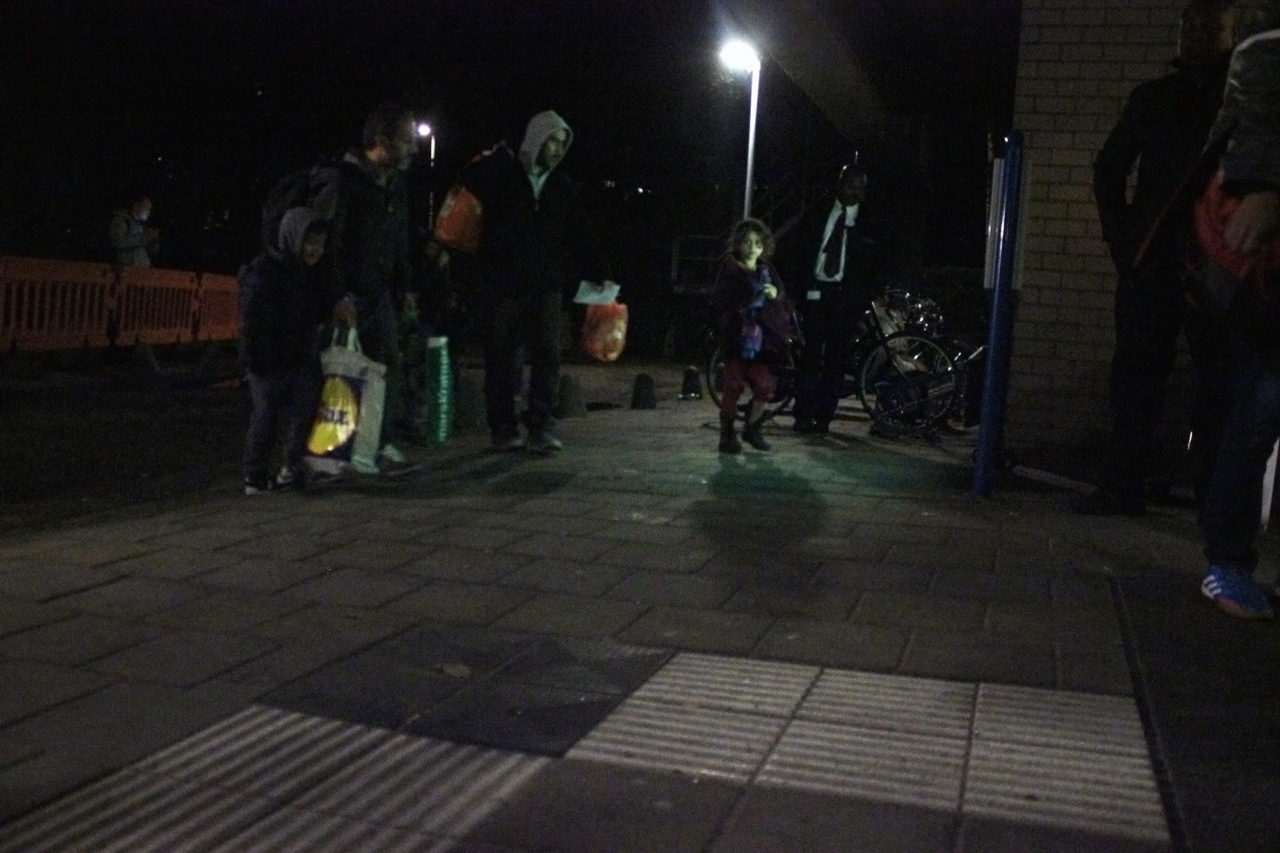 De eerste vluchtelingen zijn aangekomen in het sportcentrum van Erasmus Sport. Sommigen komen met een touringcar de campus op rijden, anderen komen lopend aan.