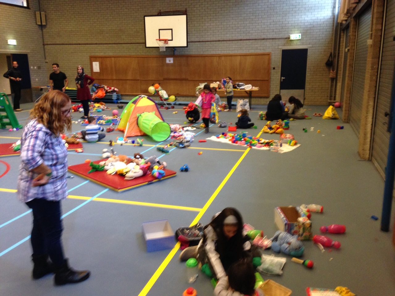 De drie studentes zijn alle drie actief bij Antibarbari en weten van aanpakken, in no time is het speelgoed gesorteerd en verplaatst naar een van de kleinere sportzalen die nu is ingericht als recreatieruimte voor kinderen. “Het is een beetje anarchistische sfeer”, vat Evelien, ook actief bij Antibarbari, de sfeer samen. “Er lopen veel mensen en iedereen doet gewoon wat hij denkt dat goed is.”