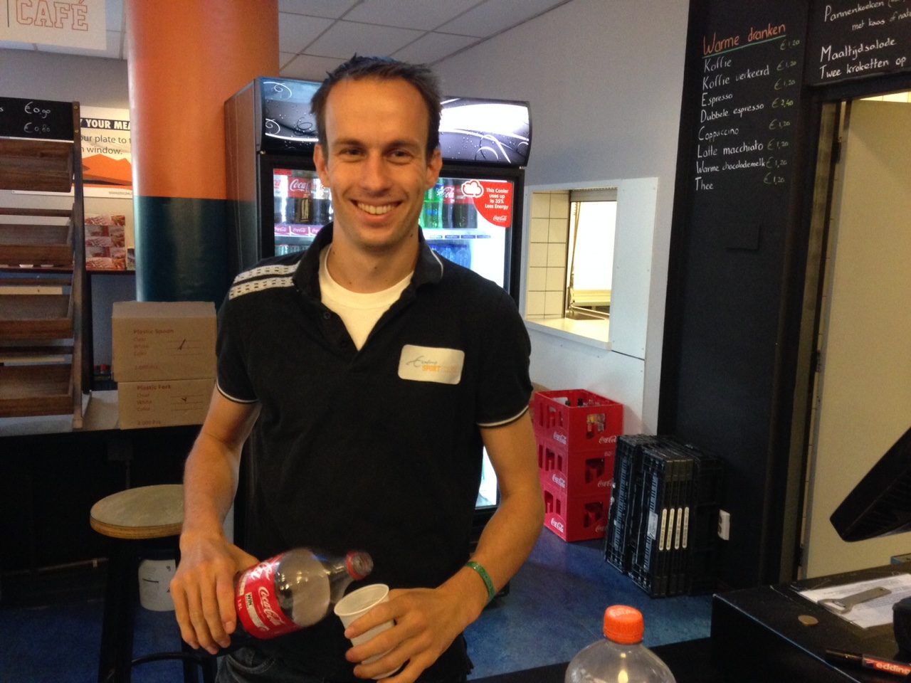 Achter de bar van het sportcentrum lijkt er geen einde te komen aan de shift van Kevin – vaste barman van Erasmus Sport. Hij was er donderdagavond en de hele nacht. Sliep thuis een paar uur, deed boodschappen voor de kantine, vierde nog even de verjaardag van zijn vriendin, en was zaterdagochtend weer vroeg present.