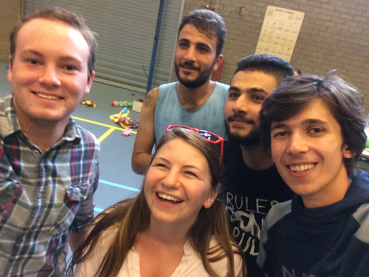 De oudere kinderen en wat jonge mannen spelen basketbal en zaalvoetbal met de studentvrijwilligers. “Ze moesten eerst lachen toen we met drie meiden binnenkwamen”, zegt Evelien, “maar toen ze zagen dat we écht konden voetballen, zeiden ze: you’re good.” Er worden selfies gemaakt door de studenten met de vluchtelingen.