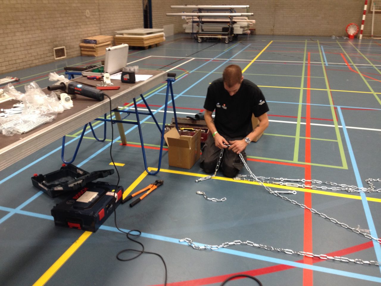 In de grote gymzaal, waar de vluchtelingen vannacht nog lagen te slapen, zijn twee mannen bezig om basketbalnetten op te hangen. Ze hebben maar weinig meegekregen van de noodopvang. “We waren hier vanmorgen om 8 uur al, toen konden we nog niet aan de slag. Toen zijn we maar een bak koffie gaan drinken”, zegt een van hen.