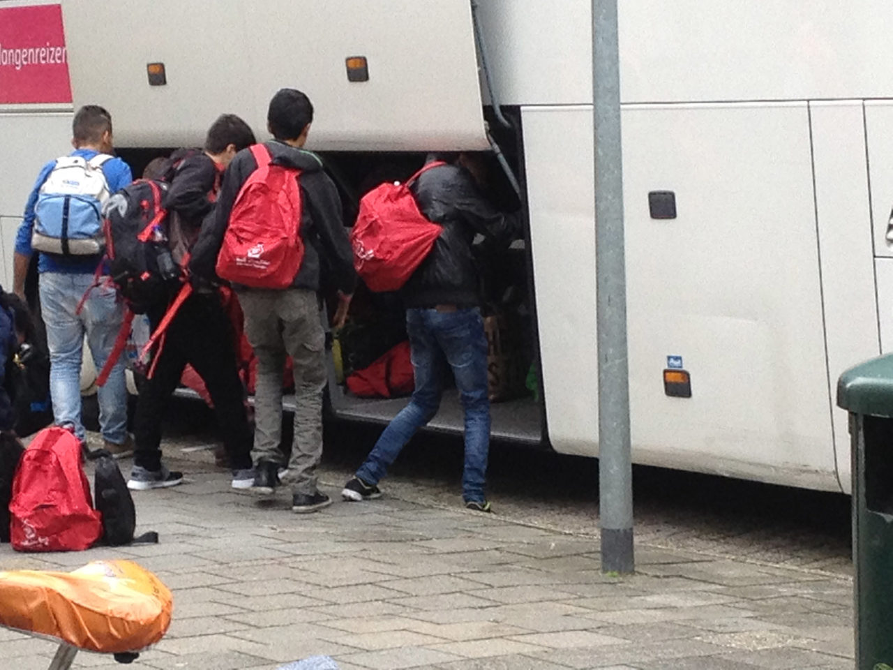 Rond 11.00 uur vertrok de eerste bus. Een groep vrouwen die de afgelopen dagen veel contact heeft gehad met de vluchtelingen werd door beveiligers op afstand gehouden. Ze wilden snoepjes uitdelen voor het Offerfeest, maar dit was niet toegestaan. Uiteindelijk konden de vrouwen alleen bij de uitgang van de campus de bussen uitzwaaien.