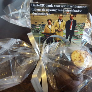 Ook collegevoorzitter Pauline van der Meer Mohr maakt van de gelegenheid gebruik om iedereen hartelijk te bedanken, want zonder die vrijwilligers had de universiteit het niet gered. “Er is geen pluim groot genoeg voor alle mensen die zich zo belangeloos hebben ingezet voor de universiteit. Het COA (Centraal Orgaan opvang Asielzoekers) was in geen velden of wegen te bekennen en het Rode Kruis had voornamelijk heel erg veel verband bij zich. Het waren uiteindelijk onze vrijwilligers die de vluchtelingen echte hulp aanboden door aspirientjes uit te delen en activiteiten te organiseren.”