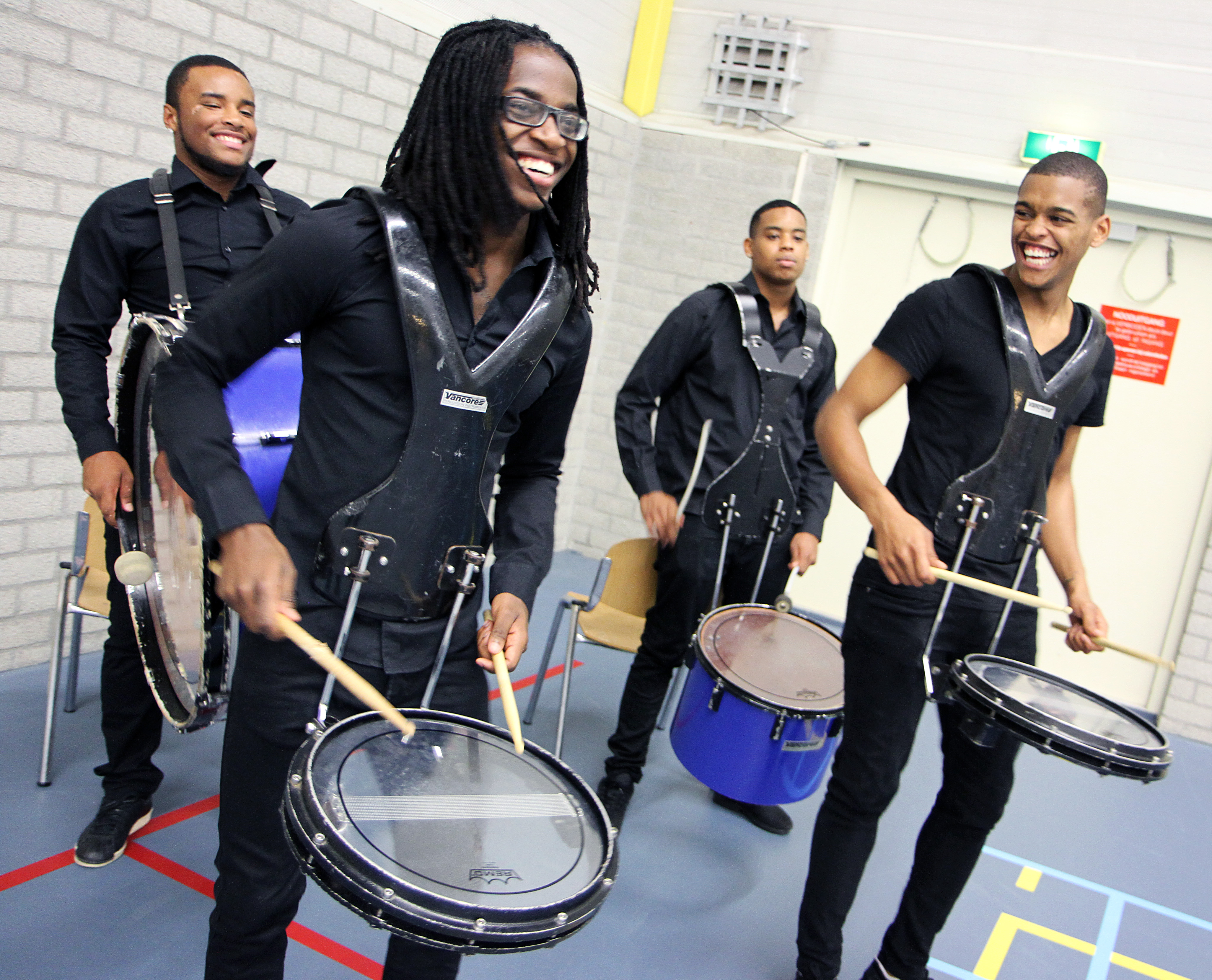 Onder begeleiding van een mini-percussieband, die al trommelend, met juf Conny mee springt, was dat gistermiddag nog leuker om te doen. Zeker dertig studentes- en helaas een enkele heer- maakte van de gelegenheid gebruik om in het kader van de Sport Dies een proefles Aerobics BBB bij juf Conny te nemen. Na tien minuten zaten de termen er helemaal in en werd er lekker gezweet en gestreden.