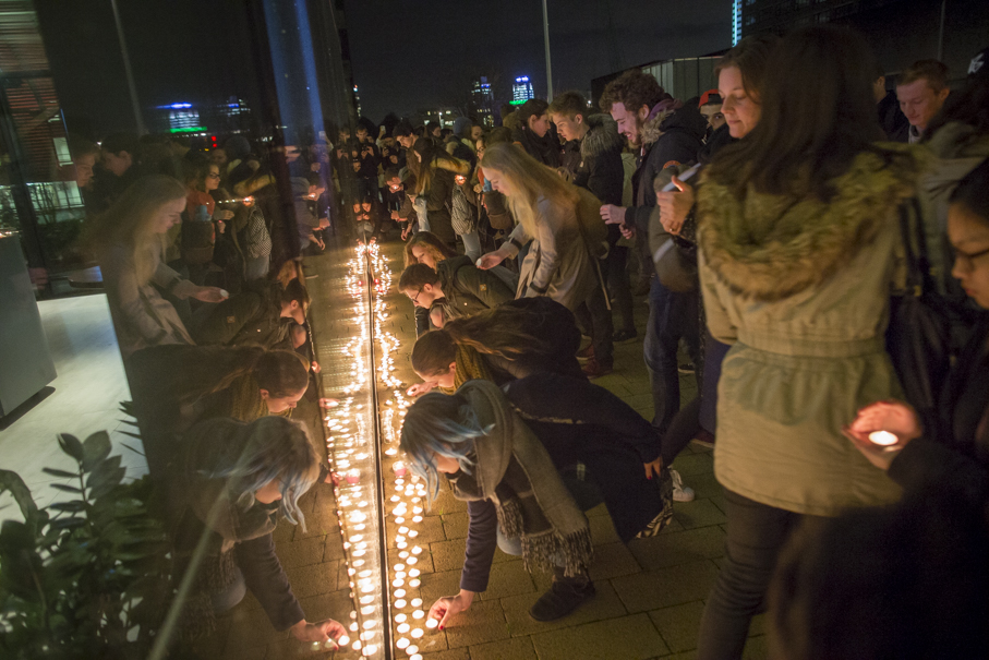 Na het moment van stilte, steken de aanwezigen kaarsjes aan voor het Erasmus Paviljoen en blijven nog wat napraten met elkaar.
