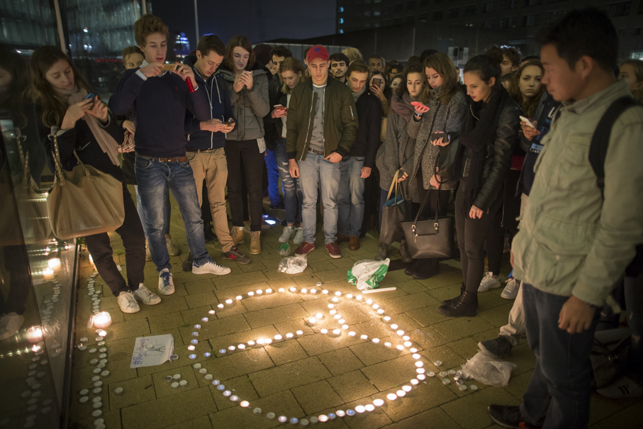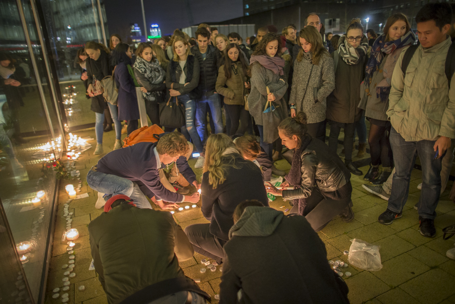 “We herdenken niet alleen de slachtoffers in Parijs, maar ook die in Beiroet en Egypte; iedereen kan geraakt worden”, vertelt Gianotta, terwijl hij waxinelichtjes uitdeelt aan de aanwezigen. Hij is overweldigd door de belangstelling. “Toen ik het event aanmaakte op Facebook, waren er vierhonderd aanmeldingen in een half uur. En de steunbetuigingen kwamen niet alleen van Fransen; dat heeft me geraakt.”