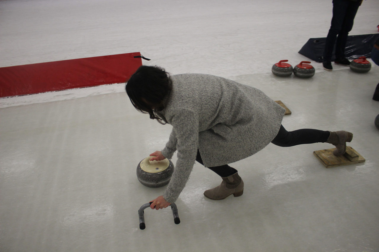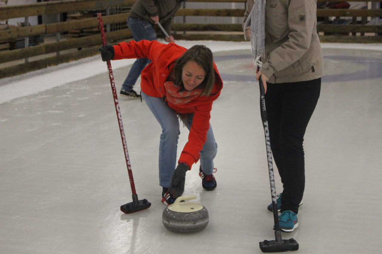 Volgens de instructeur, die zelf eigenlijk ijshockeyer is, draait het allemaal om de balans bij de push off. “Zolang je recht blijft gaan kun je de steen beter sturen, balans is dan ook heel belangrijk.” Nadat de deelnemers genoeg geoefend hebben met het wegduwen van de stenen is het tijd voor een wedstrijd. Op twee verschillende velden nemen de deelnemers het tegen elkaar op, uiteindelijk wordt de eerste prijs verdeeld over twee van de teams.