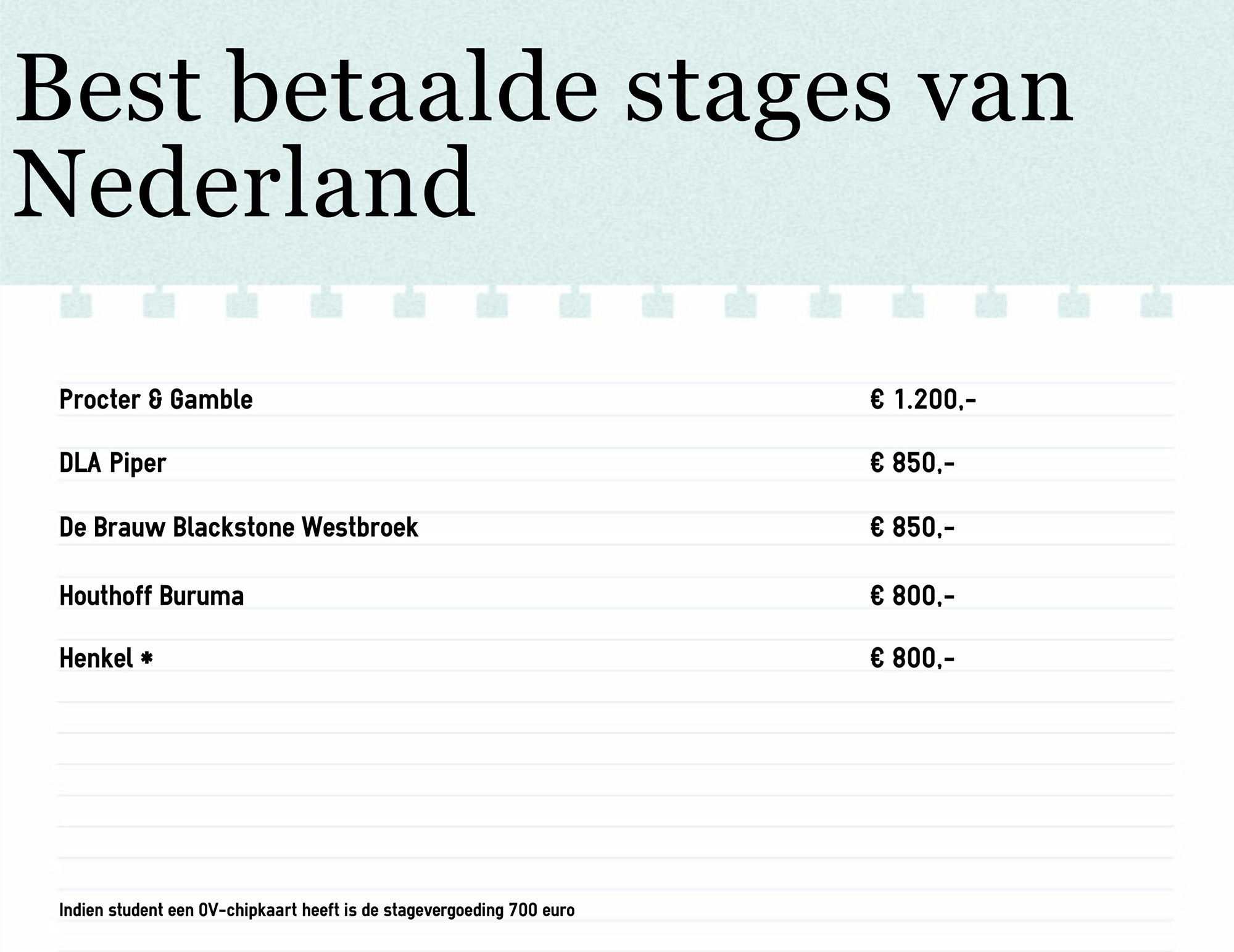 De meeste kans om een goed betaalde stage binnen te harken heb je als je rechten studeert, zo concludeert het NRC aan de hand van cijfers van Magnet.me. Drie van de vijf bedrijven in de top 5 royale stagevergoedingen zijn advocatenkantoren. Toch weet geen van die drie kantoren de nummer 1-plek te bemachtigen, die is gereserveerd voor Procter & Gamble die maandelijks 1.200 euro stort op de rekening van hun stagiaires.