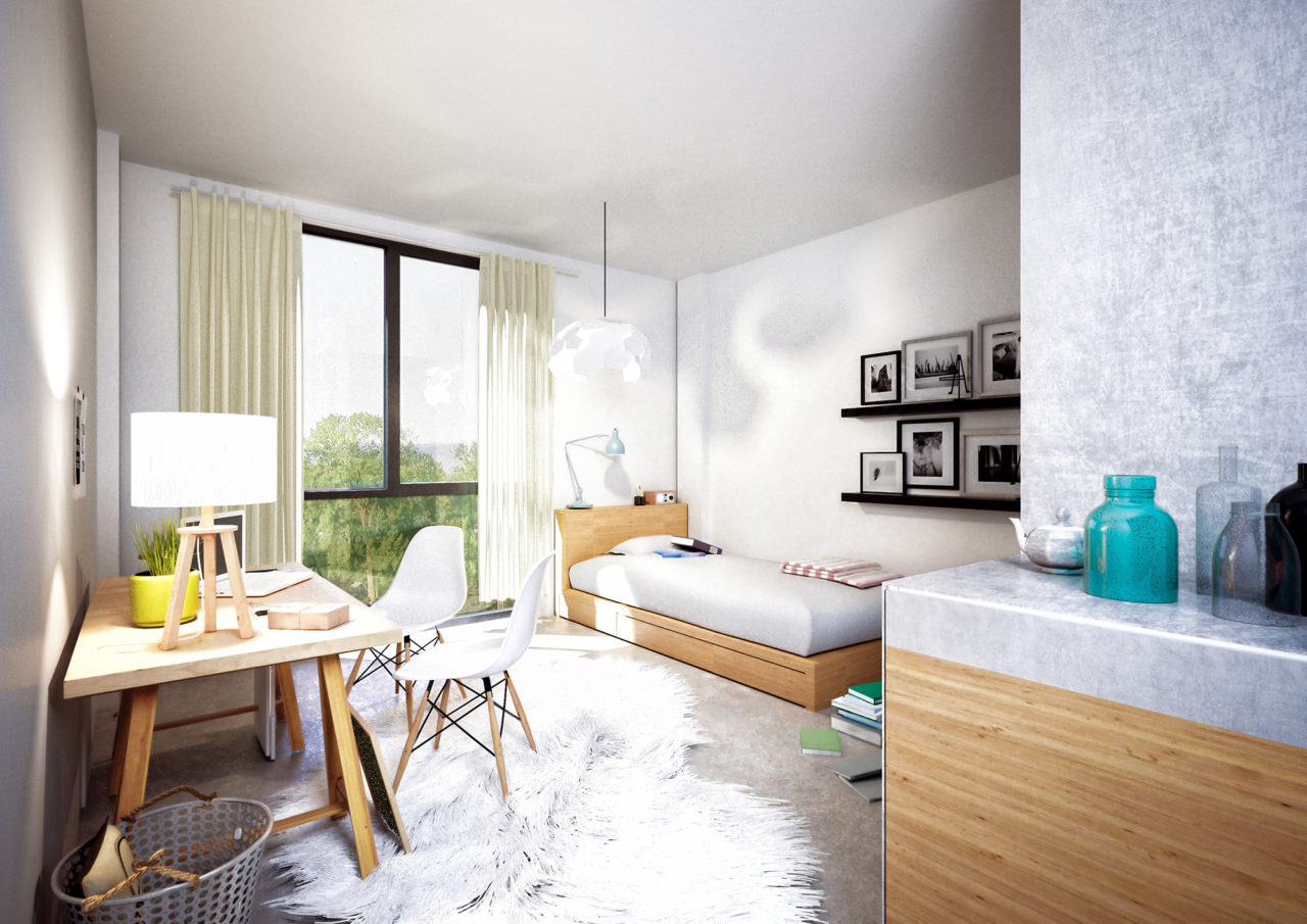Projectontwikkelaar Peter van Drunen ontwikkelde samen met architectenbureau Mecanoo een plan voor het studentencomplex, dat pal naast de tramlus gebouwd zal worden. Op de begane grond komen kamers van 30 tot 40 vierkante meter. “Ze worden voorzien van een badkamer, toilet en pantry”, vertelt Van Drunen. Het plafond wordt op de begane grond zo’n vier meter hoog, en daardoor is er ruimte voor een entresol, een soort tussenvloertje waaronder de badkamer en toilet geplaatst worden. De kamers op de verdiepingen zijn ook zelfstandig, maar kleiner: tussen de 22 en 24 vierkante meter.