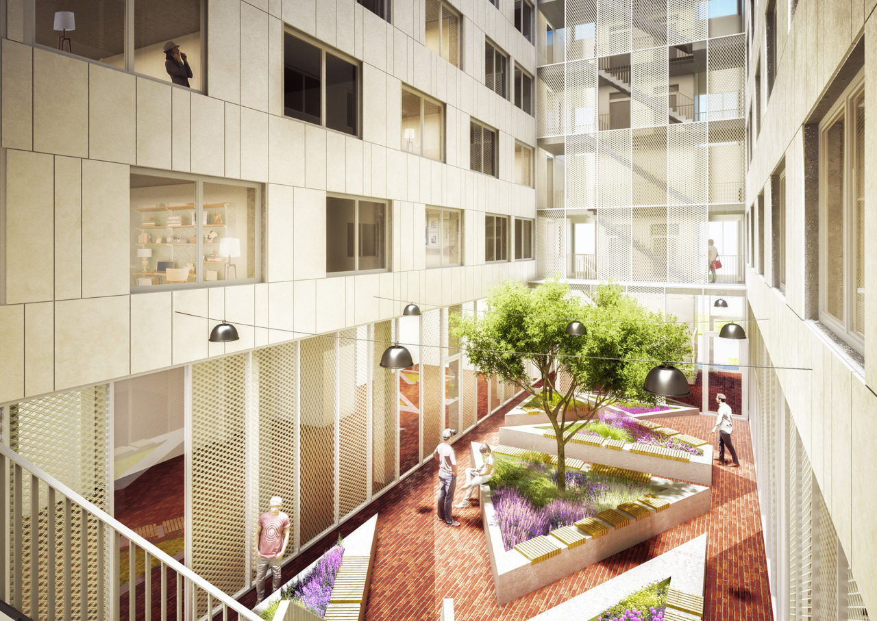 Op de binnenplaats komt ruimte voor een afgesloten fietsenstalling. Een andere luxe is het dakterras met uitzicht op het Excelsiorstadion. “Of je ook echt kan meegenieten van de wedstrijden durf ik niet te zeggen, dat zou wel een stunt zijn!”, glundert Van Drunen.