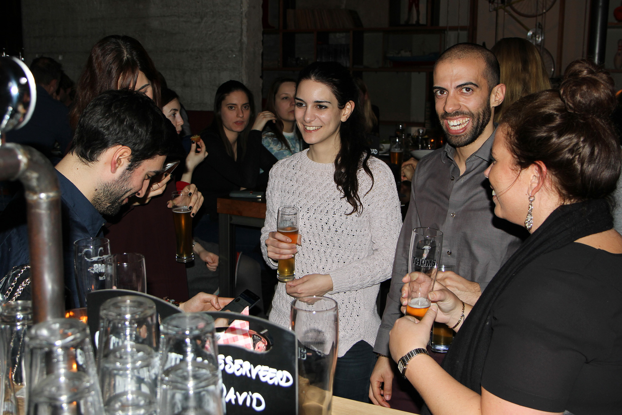Dus ja, hoopgevend is het zeker dat in Thoms direct het oog valt op wat bollebozen rondom een laptop. Ze zitten in een kring, discussiëren met elkaar over wat schetsen en tekeningen. Is hier een miljoenenidee in wording? De ene helft hangt op een bankje, de rest zit op de ietwat ongelukkige stoelen. De heren, eind twintig, houden zich staande met authentiek ‘Rotterdamsch’ bier.