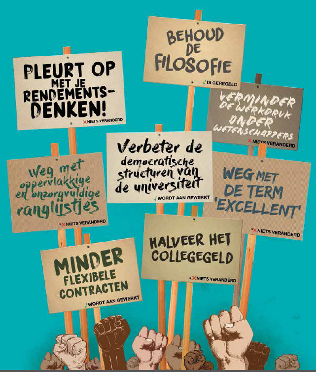 De wensen van de betrokken academici varieerden van een fundamenteel debat over de rol van universiteiten, tot het tegenhouden van reorganisaties. En van een halt toebrengen aan het zogeheten ‘rendementsdenken’, tot het verminderen van de werkdruk onder wetenschappers. Als je alle grieven, eisen en voorstellen van Rethink, De Nieuwe Universiteit en Philosophy Ground op een rij zet, krijg je een tamelijk caleidoscopisch verhaal over wat er anders zou moeten. En als je er een to-do-lijstje van maakt, zijn er een lente later bar weinig actiepunten af te vinken.