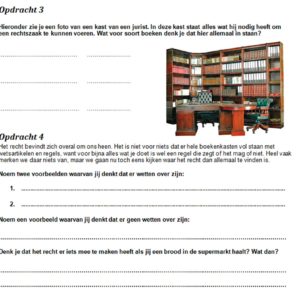 Aan de hand van een zelf ontwikkelde lesmodule laat de commissie basisschoolkinderen op een speelse manier kennismaken met het Nederlandse rechtssysteem. Vragen die aan bod komen zijn ‘Wat is een rechter?’ en ‘Waarom hebben we rechten en plichten?’. De lesmodule wordt momenteel door 11 basisscholen gebruikt.