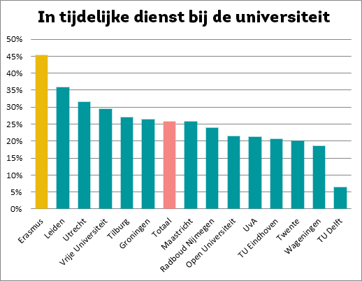Volgens woordvoerder Jacco Neleman is dit bij de Erasmus Universiteit het geval. “Als we kijken naar het aandeel tijdelijke dienstverbanden van korter dan vier jaar komen we in 2014 op 21 procent uit. Zelfs met tijdelijke tutoren, die zijn aangesteld door de fluctuerende studentenaantallen, voldoet de EUR dus aan de norm van 22 procent. Er is daarom geen noodzaak om beleid op dit vlak te ontwikkelen.”