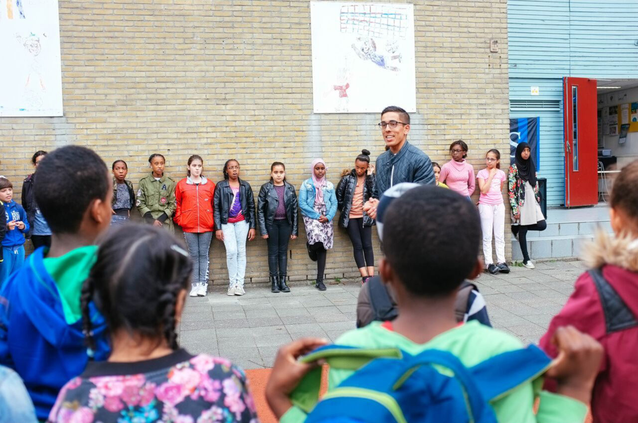 “Het lijken wel pabostudenten, zo goed als ze met kinderen kunnen omgaan”, vindt Canan Yildirim, juffrouw van groep 7 en 8 van de Groene Palm. Ze is zichtbaar blij met de EUR-studenten van zaalvoetbalvereniging RS, die met haar klas aan de slag gingen. Sinds eind april trokken de zaalvoetballers en de scholieren elke twee weken samen op om uit te zoeken hoe er meer verbinding in de buurt kon ontstaan. Daarvoor gingen ze onder meer samen de wijk in en bereidden ze een groot buurtfeest op het schoolplein voor.