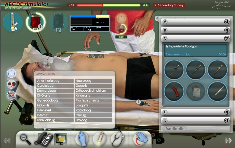 Hoe je moet reageren in levensbedreigende situaties leer je niet uit boeken, dat zul je gewoon moeten doen en ervaren. Maar dat is nogal moeilijk als het gaat om mensenlevens en noodsituaties. Met de financiële steun van het Erasmus MC en de huisartsenopleiding SBOH konden Stephanie Klein Nagelvoort-Schuit (internist Acute geneeskunde) en ondernemer Ronald Nanninga het simulatiespel abcdeSIM ontwikkelen. Het spel is op de computer te spelen en traint medewerkers op de spoedeisende hulp in de abcde- methode: een methode waarbij hulpverleners op gestructureerde wijze de patiënt beoordelen en behandelen.