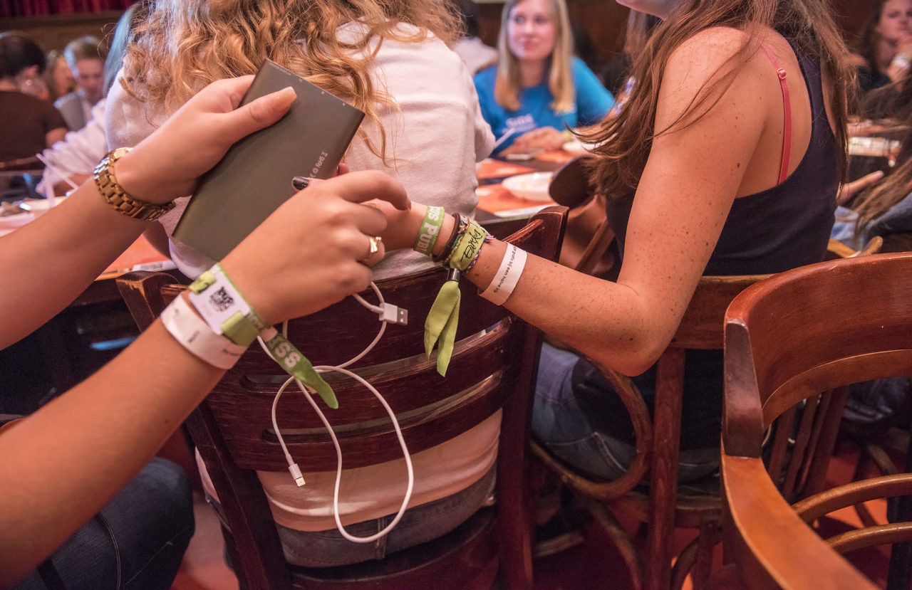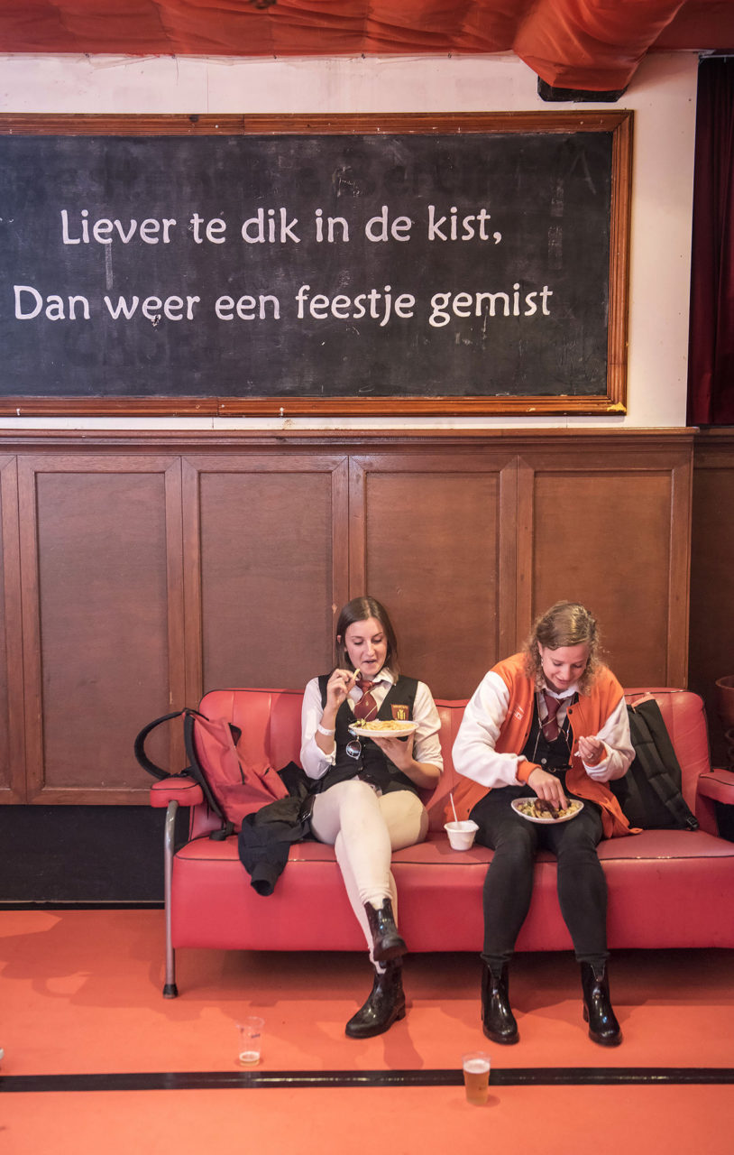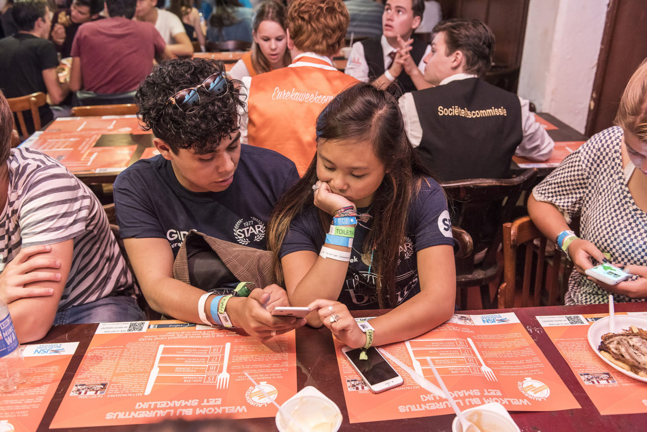 De vereniging krijgt vanavond tweemaal een lading van 105 studenten te eten. Die komen druppelsgewijs binnen, waardoor telkens hetzelfde tafereel te zien is: student gaat zitten aan de lange tafel, doet de armen over elkaar en signaleert spoedig de ongemakkelijkheid. Dus: telefoon op tafel. Mama mag best een app’je ontvangen. Zo ook vriendinlief, die thuis maar met de handen in het haar zit.