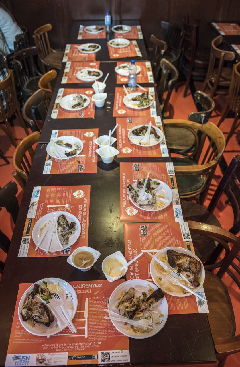 Dan komt het besef: bij Laurentius is het zelfbediening. Weer opstaan dus. Chefkok Karin (41) vult in de keuken plastic borden met kip en patat. De appelmoes staat al op tafel. Karin straalt, noemt dit de mooiste week van het jaar.