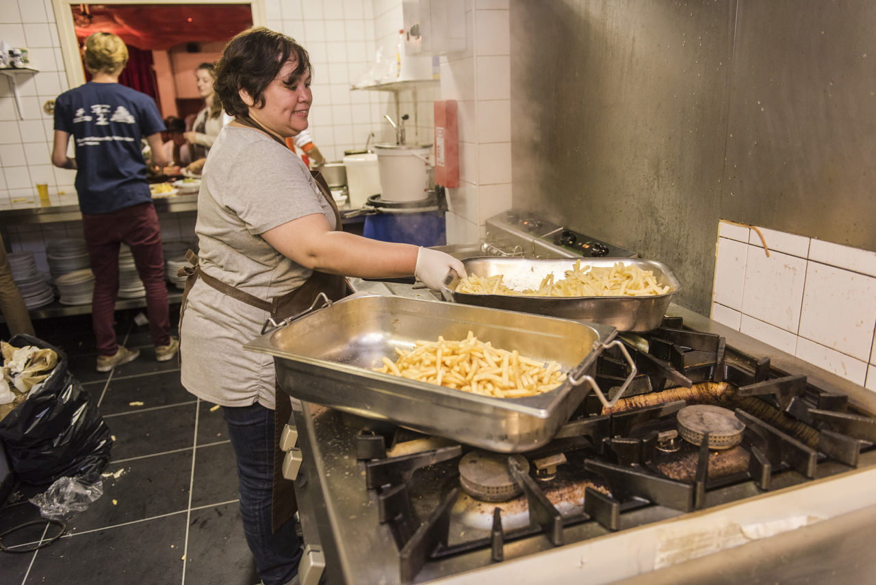 Ze stuurt in de keuken drie eerstejaars Laurentianen aan die handschoentjes dragen en plastic bekers met bier leegdrinken. Toelichting op het menu: ‘Dit vinden ze altijd lekker, dus waarom zou je het veranderen? Zij blij, ik blij. Al moet je wel een beetje gek zijn om dit te doen. Het is best een chaos.’