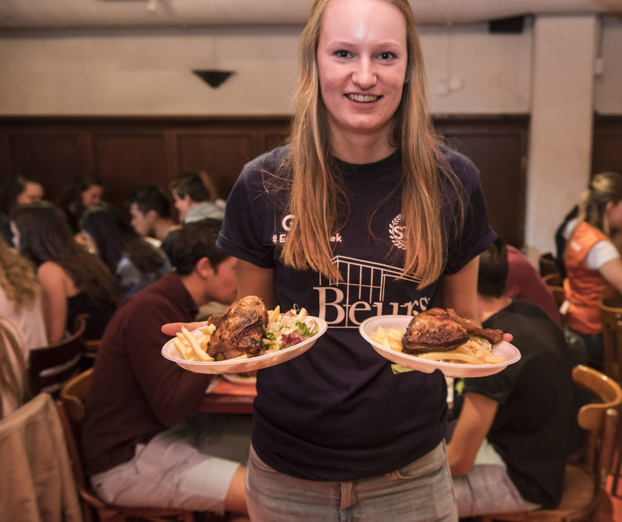 Hè, hè: eten. Zo’n 200 Eurekaweekgangers ploften gisteravond neer bij studentenvereniging R.S.V. Sanctus Laurentius, waar kip met patat en appelmoes op het menu stond. En wat was het wennen, zo’n eerste studentenmaal. ‘Ik durf de Rus naast me niet naar Poetin te vragen.’