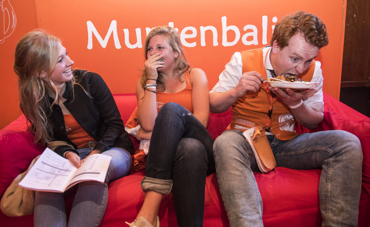 Buiten is het feest. Pompende beats galmen over de Oostzeedijk, de tap werkt uitstekend. Een enkele student waagt zich heupwiegend in de buurt van het podium, de rest geeft de voorkeur aan afstand en een verdwaasde blik. Nog liever gaan ze naar binnen. Het eten wacht, de maag knort.