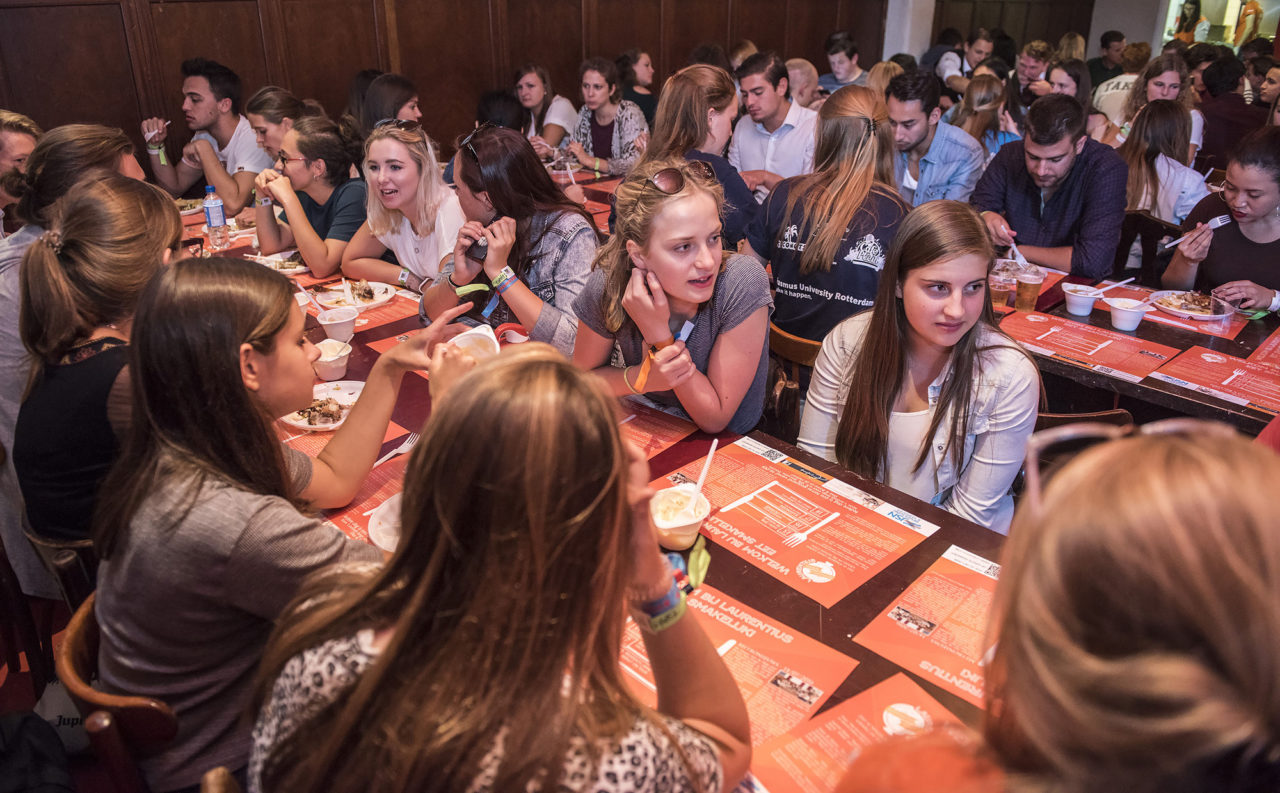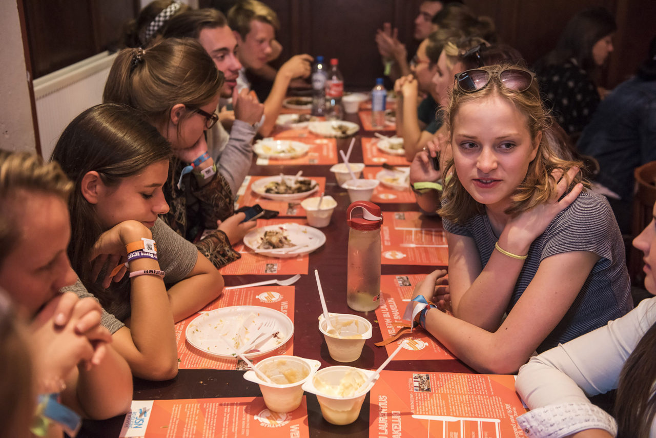 De borden worden in rap tempo leeggegeten. Tegelijkertijd komen de eerste gesprekken op gang. Zo blijkt de 17-jarige Annelore, eerstejaars University College, zich te ergeren aan haar leeftijd. ‘Ik mag niet drinken’, sipt ze. Valsspelen is er niet bij, de blaastesten van de universiteit zijn onverbiddelijk. ‘Dat wordt de hele week Fristi.’