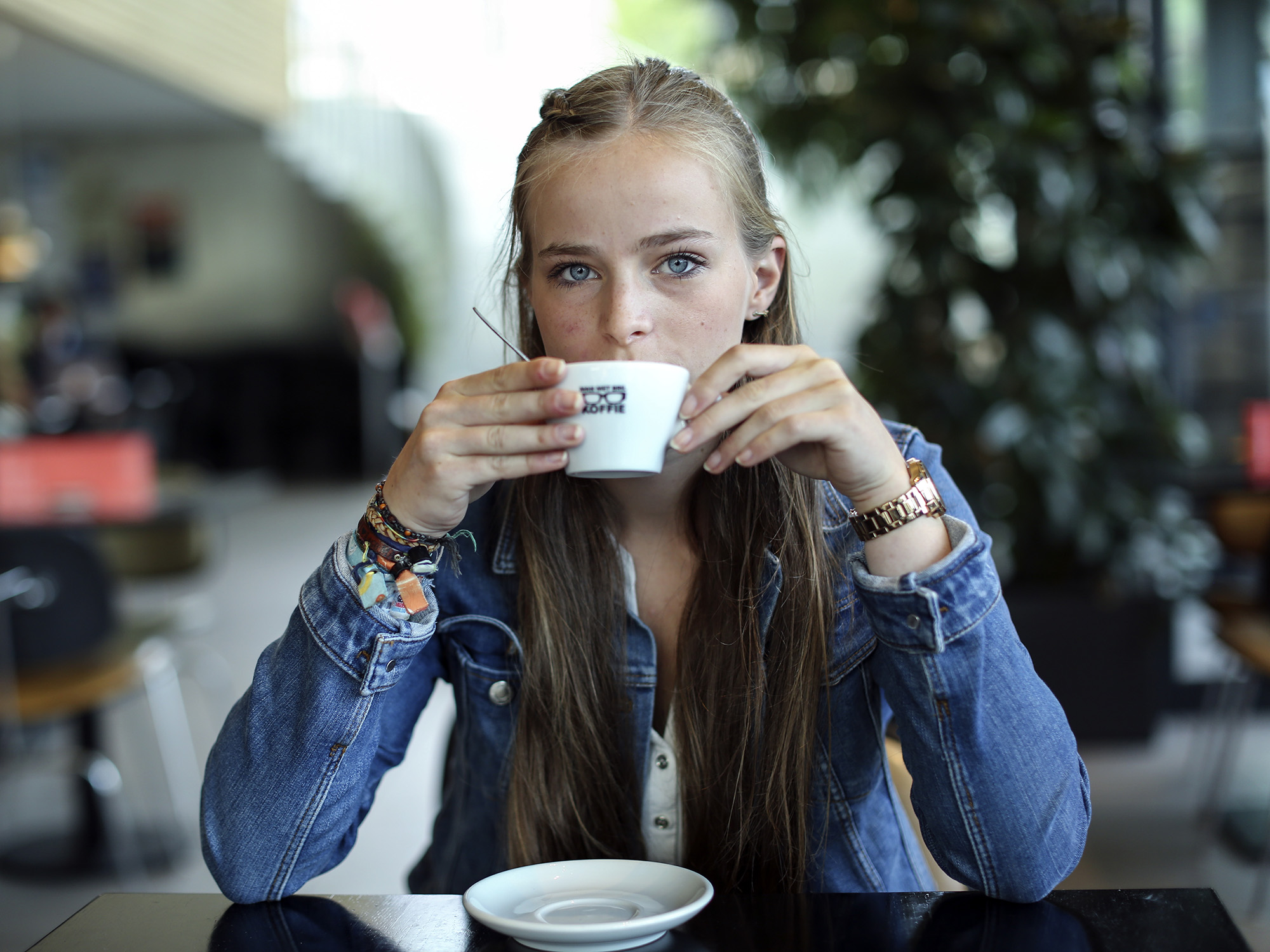 In het Erasmus Paviljoen tankt Eline even bij met een cappuccino. “Straks werkgroep. Wel balen dat ik nog geen wettenbundels heb. Die zijn thuisbezorgd toen ik al de deur uit was, hoorde ik net van mijn moeder. Voorlopig doe ik het dan maar even met kopieën. Van andere boeken trouwens ook hoor. Anders wordt het veel te duur.”