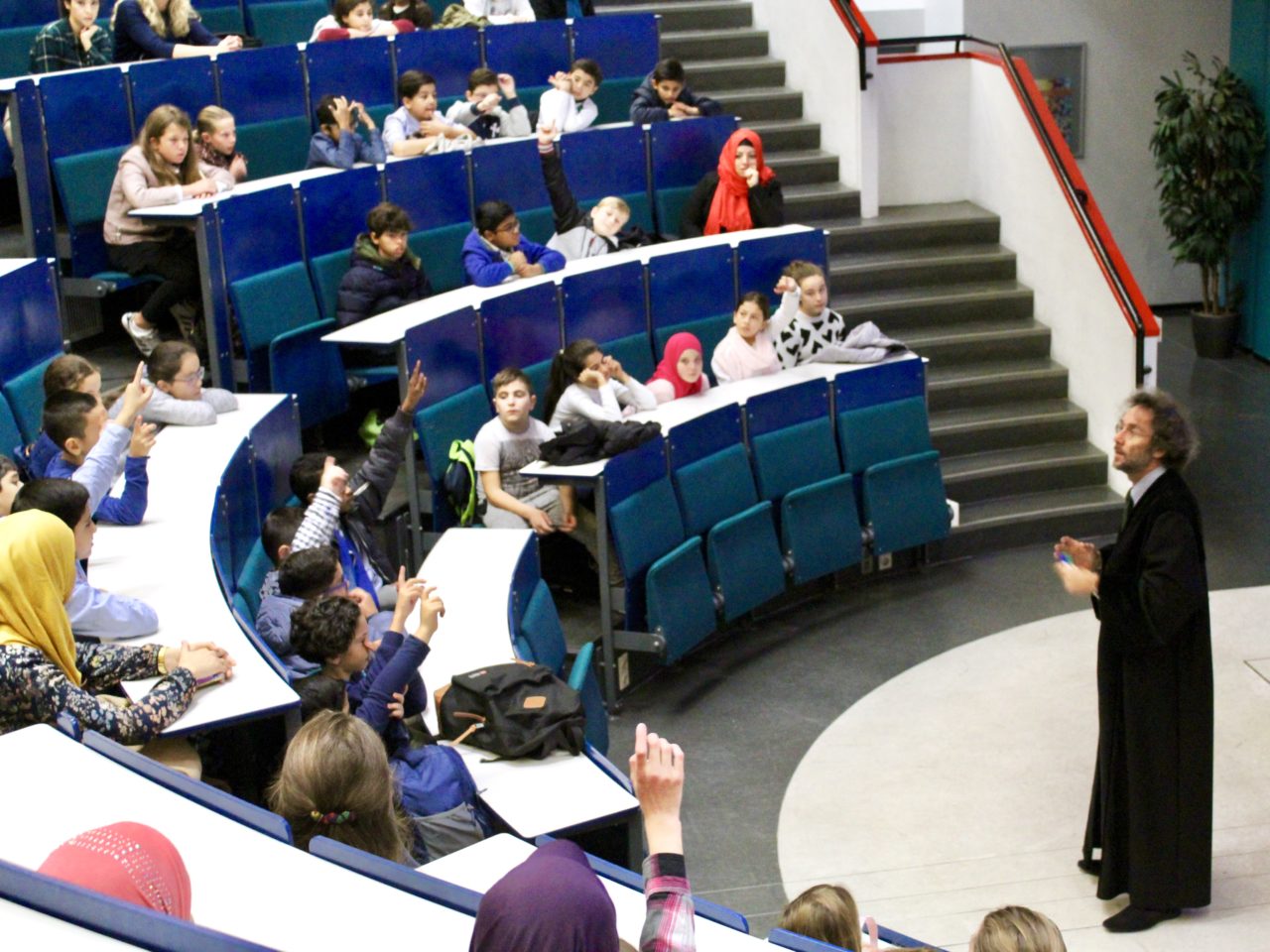 • De kinderen luisteren aandachtig naar de antwoorden van de professor