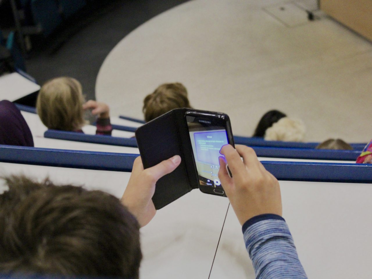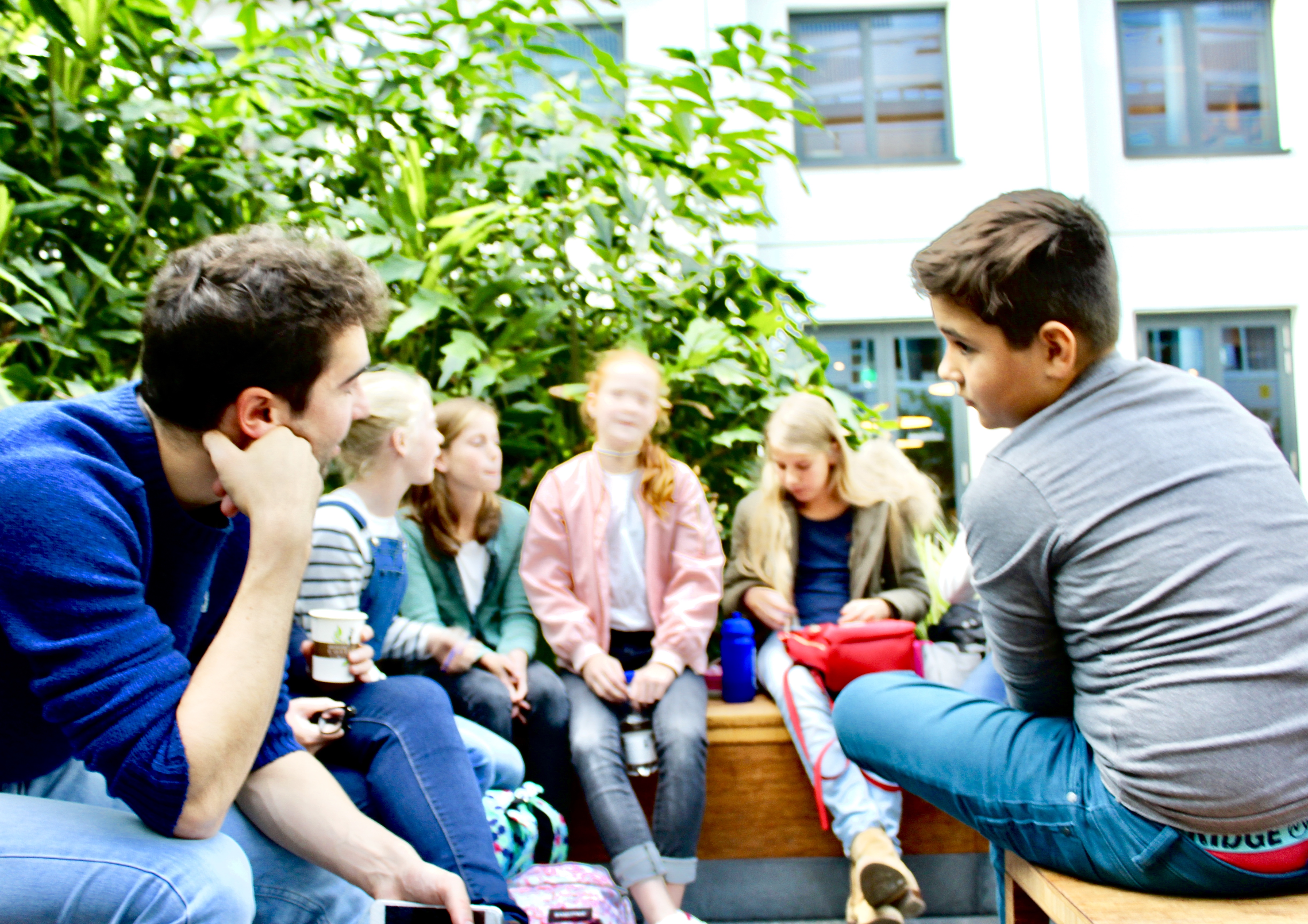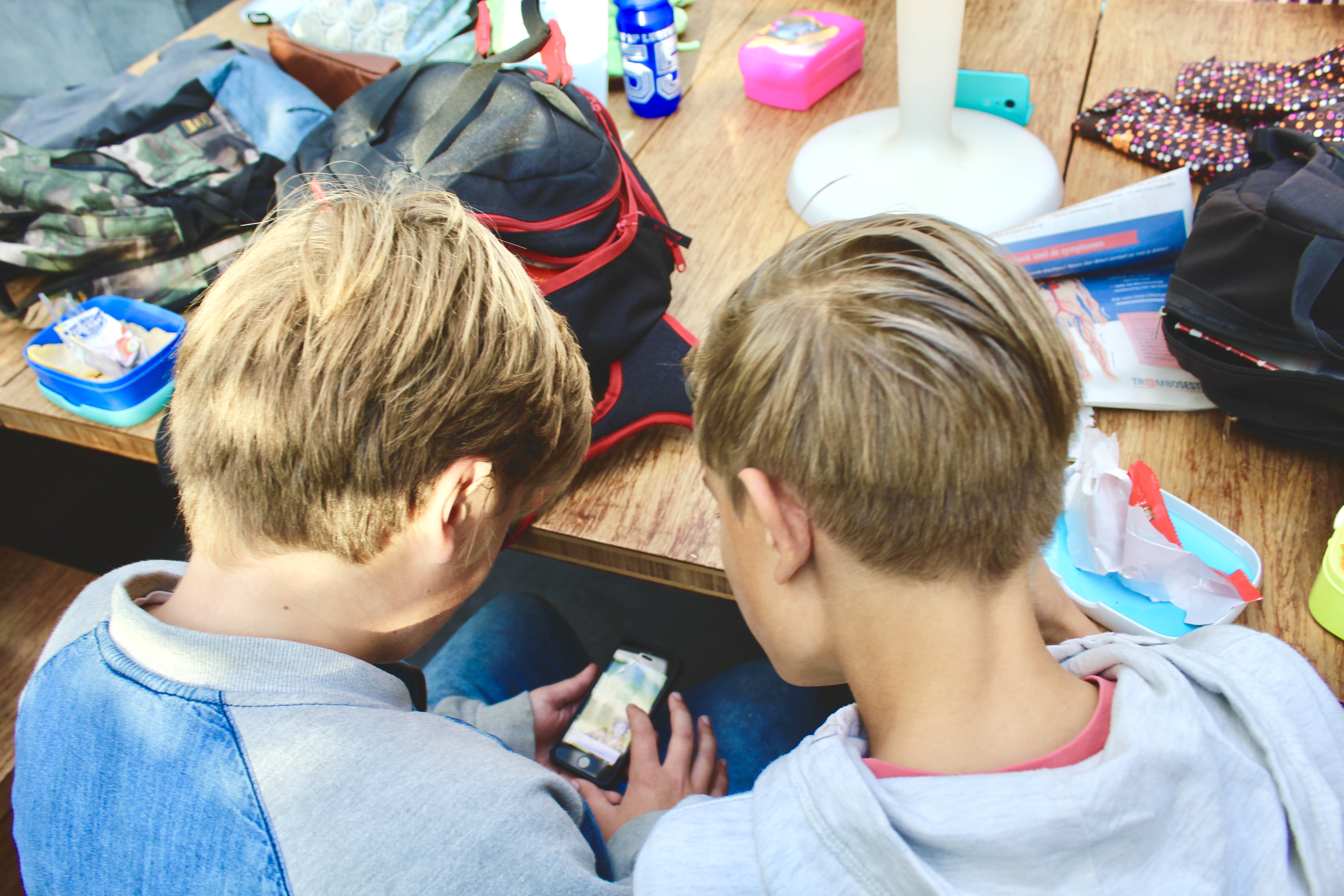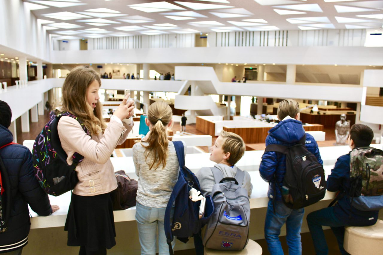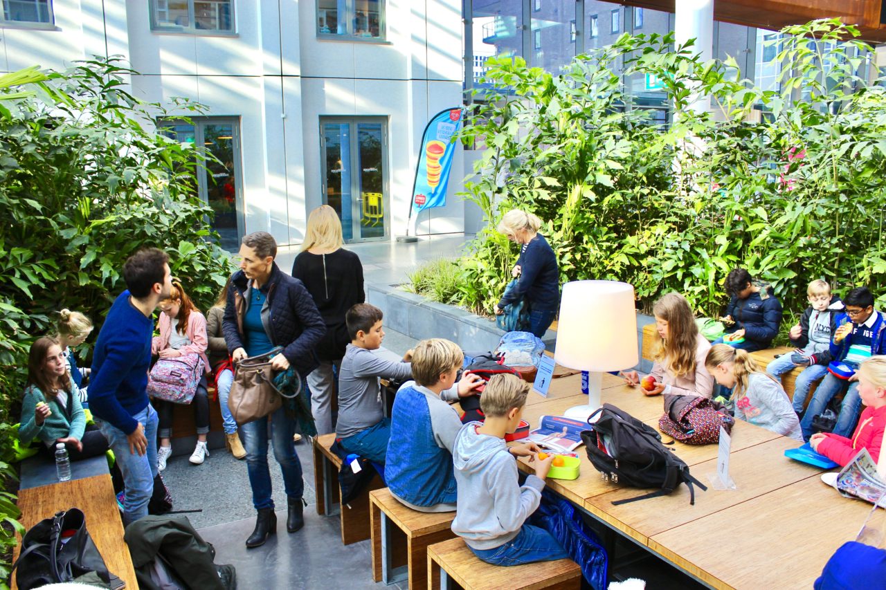 Aan het einde van de ochtend eten Tom (12), Willem (11) en Mees (11) uit Capelle aan den IJssel op een bankje in de grote hal hun boterhammen. Mees kijkt op zijn telefoon de filmpjes terug die hij tijdens het college stiekem heeft gemaakt en vertelt enthousiast over hoe leerzaam hij het vond.