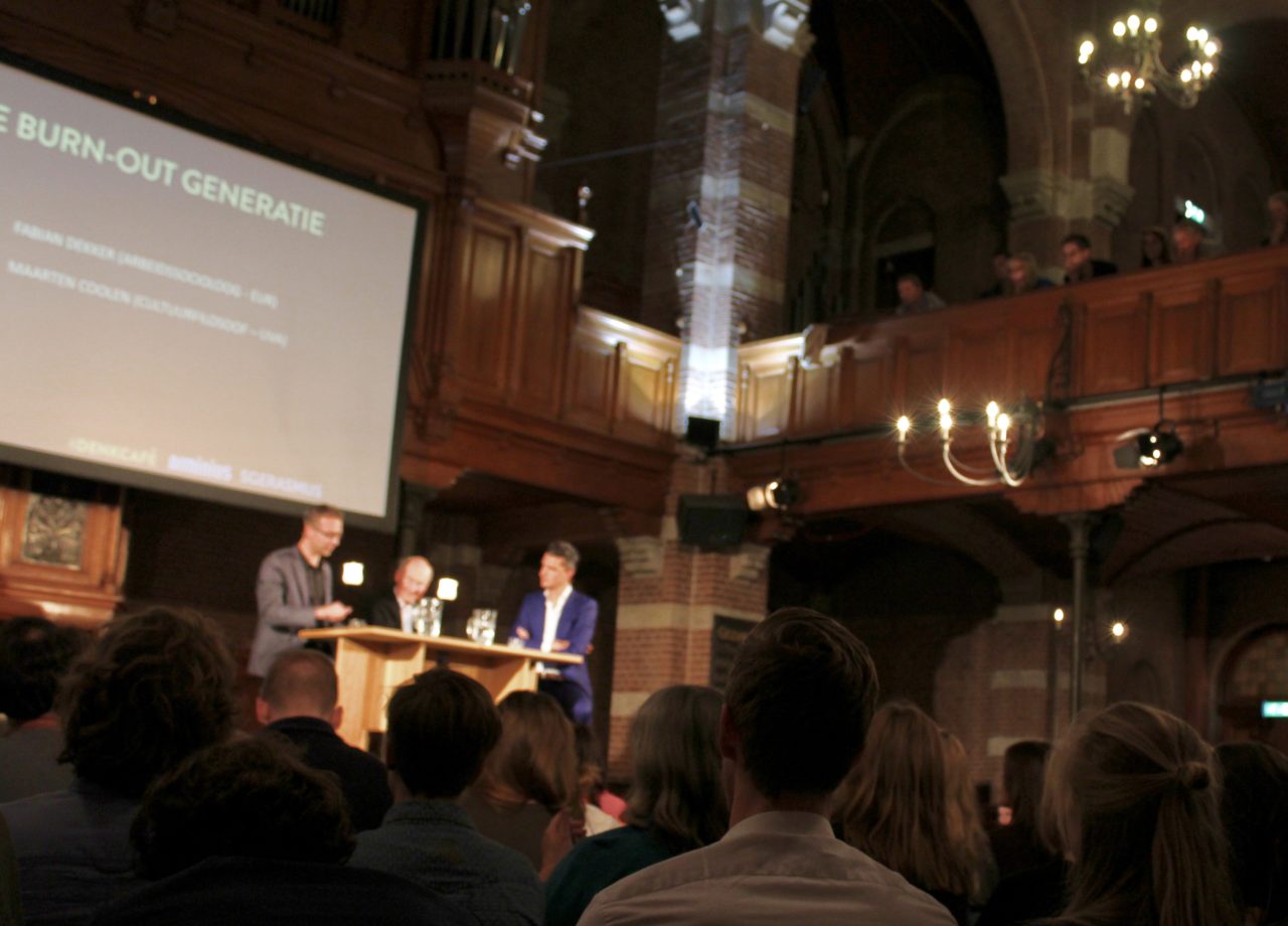 In het maandelijkse Denkcafé ging het woensdagavond over de burn-outgeneratie. Waar je misschien zou verwachten dat een burn-out pas de kop opsteekt bij mensen die een midlifecrisis naderen, blijkt uit onderzoek dat juist starters erg vatbaar zijn om opgebrand te raken: zo’n 17 procent van de 35-minners heeft burn-outklachten. Deze risicogroep is dan ook in groten getale aanwezig om samen met cultuurfilosoof Maarten Coolen, GZ-psycholoog Ton Wintels en arbeidssocioloog Fabian Dekker de burn-outgeneratie te doorgronden.