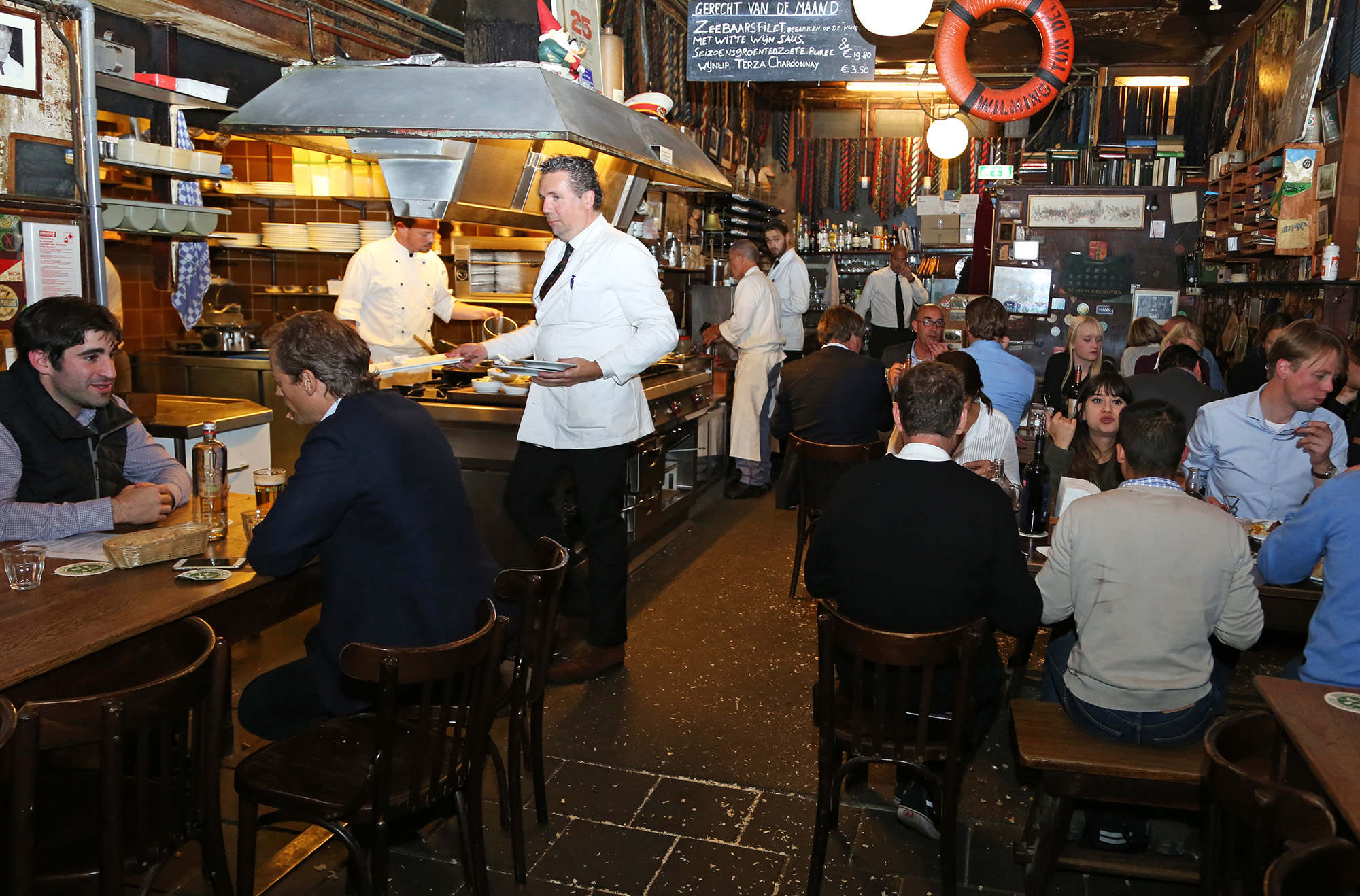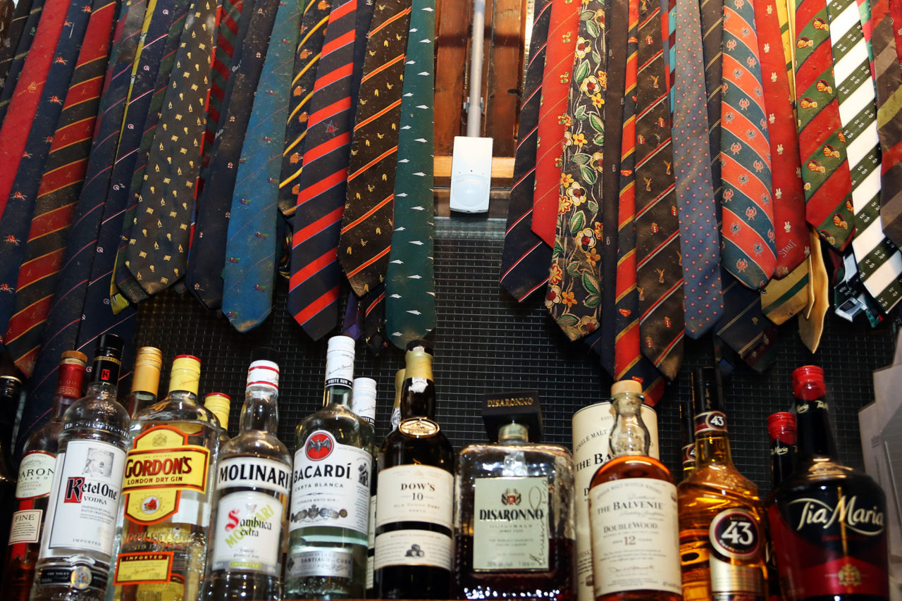 Zo werkt dat in De Pijp, een stukje hemel voor elke fan van het corps. De zaak is één grote traditie, barstend van de mooiste details. Zie de lange houten tafels – ‘drie ervan zijn uit de puinhopen van het bombardement gehaald’ – waar gasten gezamenlijk aan zitten, de pinda’s waarvan de schillen uitgespuugd op de grond belanden en de vele dassen aan het plafond.