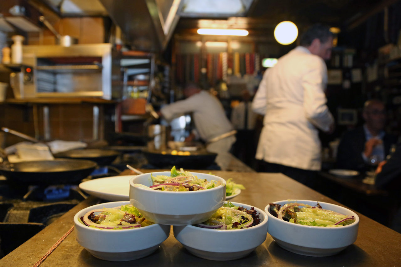 Maar de sfeer is goed in zo’n historische ruimte waar de keuken tussen de lange tafels staat. Onder gedimd licht krijgt Uw recensent zelfs de helft van het aangevreten toetje van zijn buurvrouw aangeboden. Hij weigert, maar een praatje is snel gemaakt aan zo’n lap van een tafel.