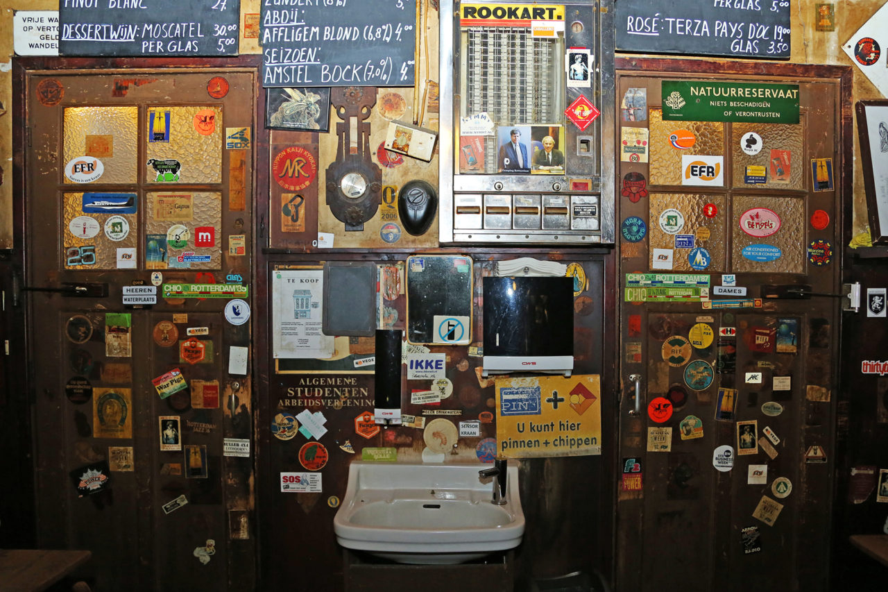 Zo werkt dat in De Pijp, een stukje hemel voor elke fan van het corps. De zaak is één grote traditie, barstend van de mooiste details. Zie de lange houten tafels – ‘drie ervan zijn uit de puinhopen van het bombardement gehaald’ – waar gasten gezamenlijk aan zitten, de pinda’s waarvan de schillen uitgespuugd op de grond belanden en de vele dassen aan het plafond.