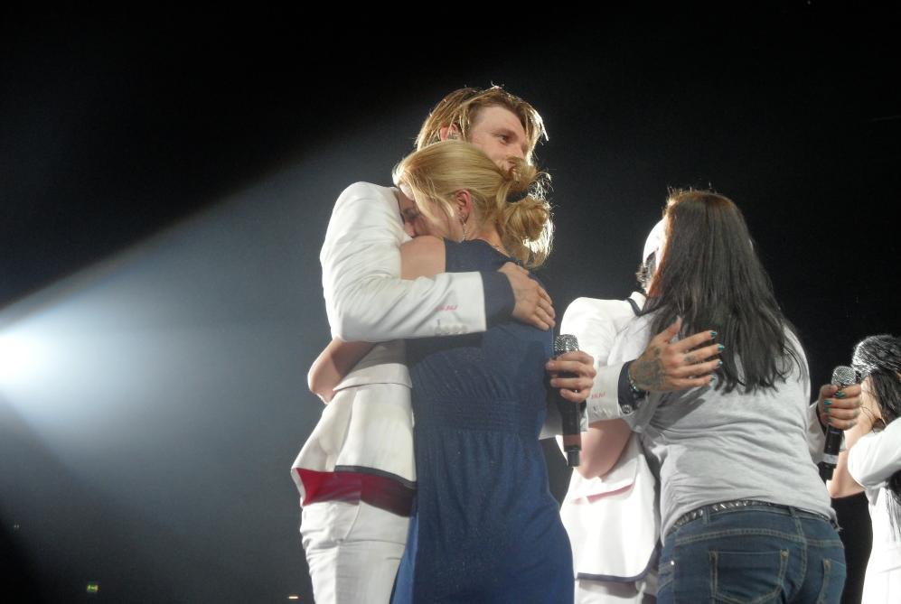 Een van de fans omhelst Nick Carter tijdens een concert in Ahoy