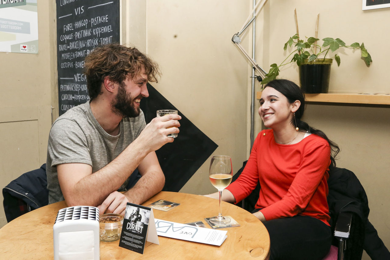 In deze knusse hoekjes zitten enkel tweetallen. Aan de bar bijvoorbeeld een duo op date, verderop twee vriendinnen. Eén jongen gaat zo op in zijn vriendin dat hij uiteindelijk met zijn voorhoofd in haar schoot belandt. Vanzelfsprekend zit niemand – vriendin incluis – daar op te wachten, al zegt het wat over de huiselijkheid van het café.