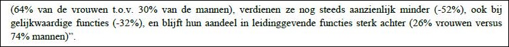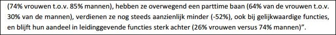 “Niet in absolute zin, maar dit rapport laat zien dat managers inschatten dat er een inkomenskloof bestaat, zegt dit rapport. Ander onderzoek bevestigt bovendien dat er ook echt een groot verschil is. Om te beginnen blijkt uit harde data die ook is opgenomen in de Gender Gap Index dat het verschil in geschat jaarsalaris (niet gecorrigeerd voor functie of ervaring) tussen mannen en vrouwen 52 procent is. Uit een onlangs verschenen rapport van het CBS komt daarnaast naar voren dat in het bedrijfsleven – zonder correctie voor bijvoorbeeld opleiding, functie of om welke sector het gaat – het loonverschil 20 procent betrof in 2014 (bij gelijkwaardige functies is het verschil volgens het CBS 7 procent, ES). Daarbij komt dat de loonkloof toeneemt na het dertigste levensjaar en dat het verschil in hogere functies nog veel groter is. Bij gelijkwaardige managementfuncties was het verschil volgens het CBS op basis van 2012 inkomensdata zelfs 34 procent.”