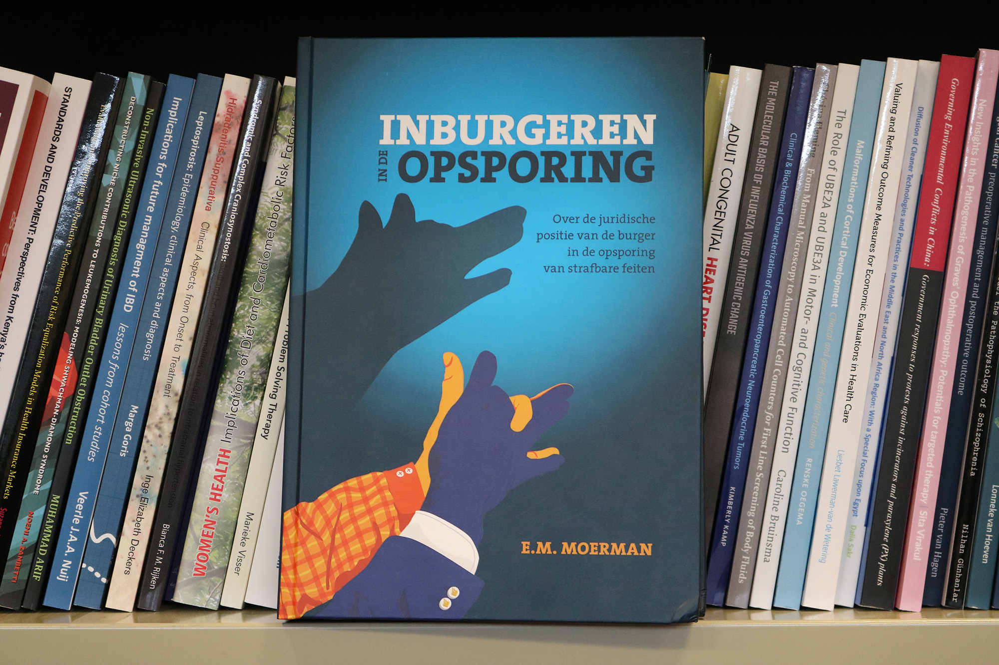 “Niet alle covers van proefschriften zijn even spannend, dus ik heb contact opgenomen met een illustrator. Je ziet mijn handen, die een politiehand en een burgerhand voorstellen. Samen vormen ze de schaduw van een speurhond: de politie en de burger werken samen in de opsporing. Helaas ziet niet iedereen dat.”
