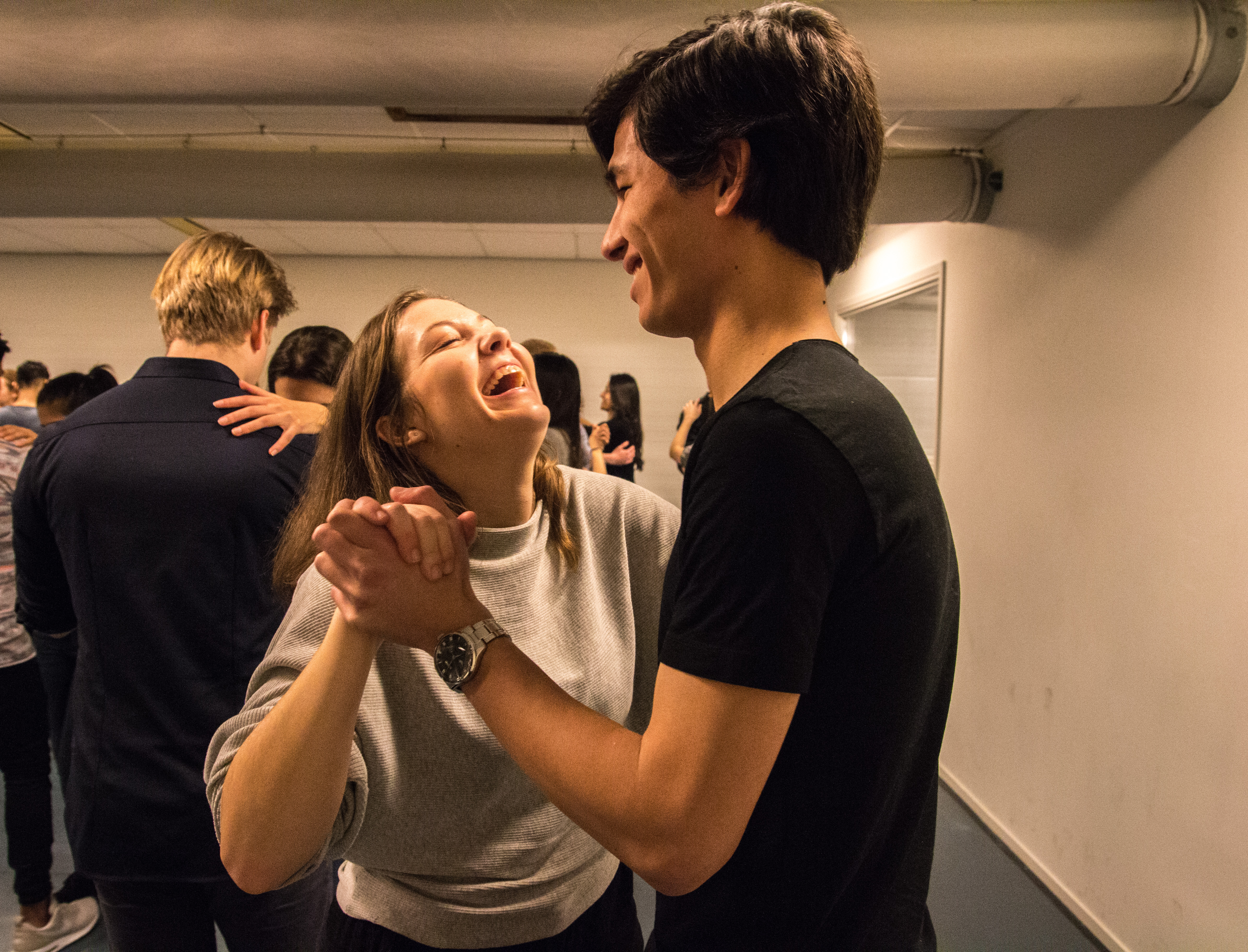 Door de swingende muziek verdwijnt de wat ongemakkelijke sfeer al gauw. Er verschijnt nu een glimlach op de gezichten van de leerlingen. Het zelfvertrouwen groeit. “In het begon vond ik het ongemakkelijk om mijn danspartner in de ogen te kijken. Maar op een gegeven moment was ik het gewend”, vertelt Sarah Fu (19, studente Fiscale Economie).