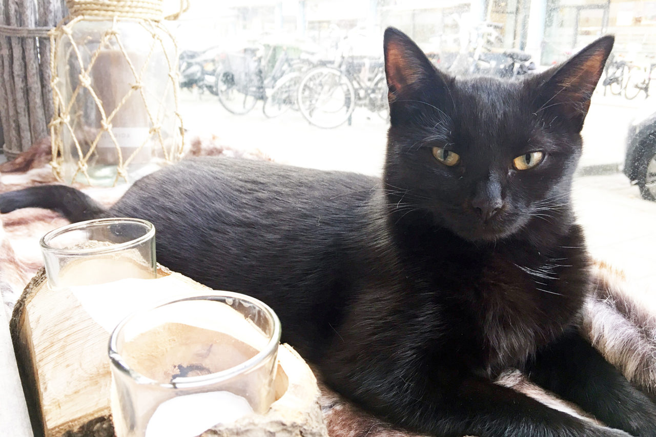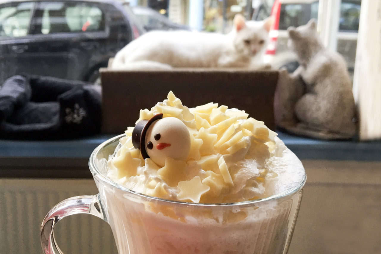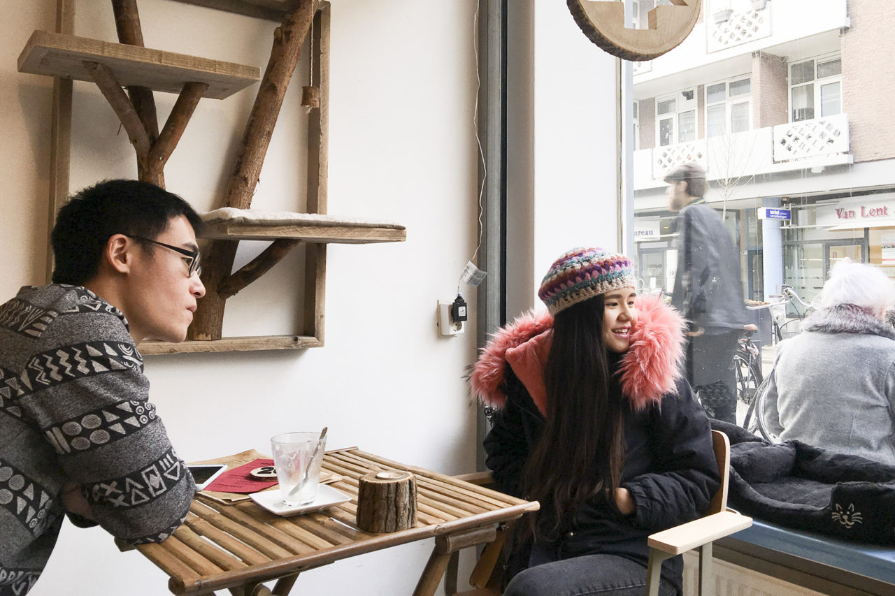 Ze geeft nog een tip: bestel cappuccino of warme chocolademelk met slagroom. Want daar komen de katten, die niet zomaar op schoot geparkeerd mogen worden, op af. Niemand weet waarom.