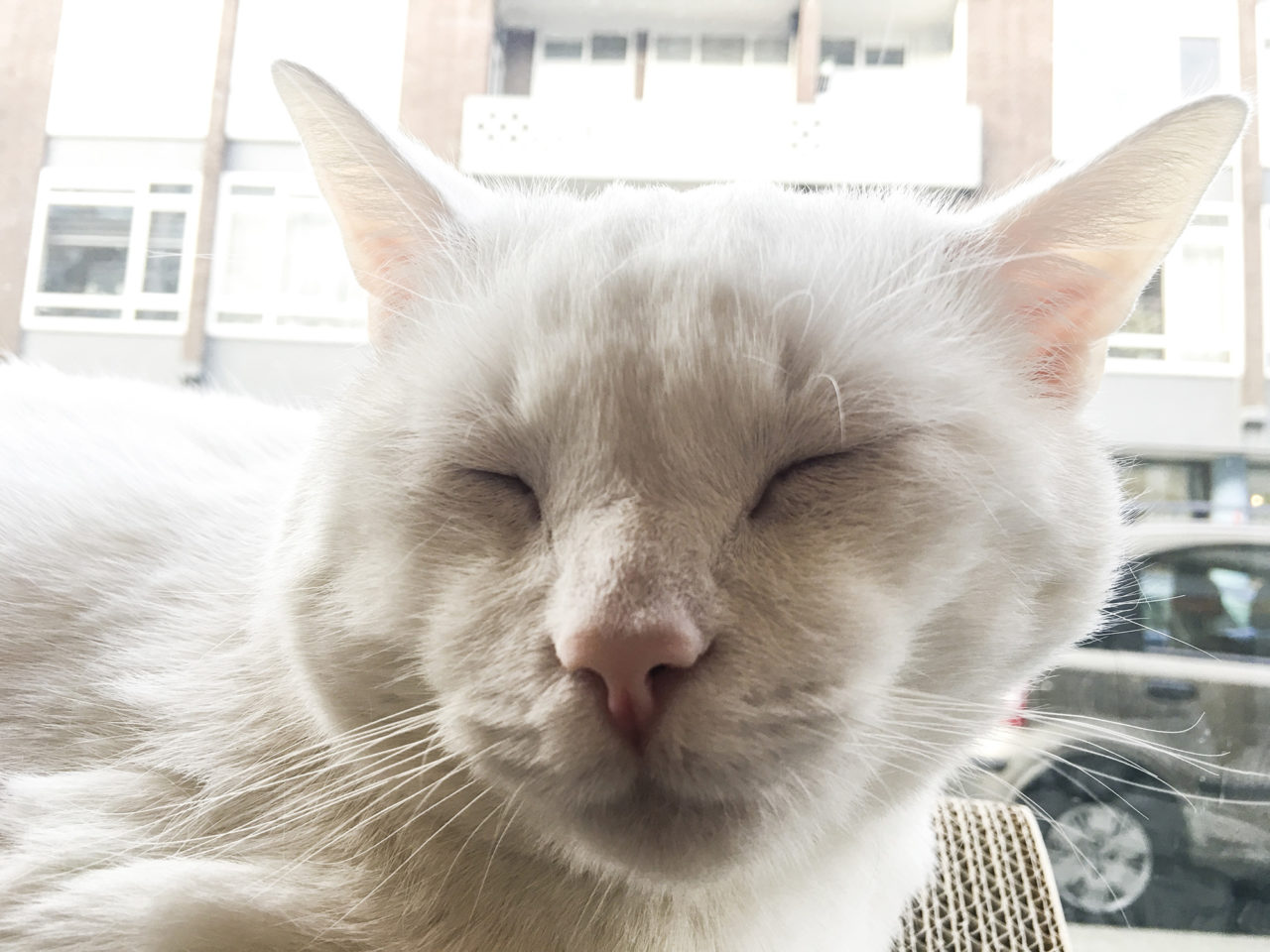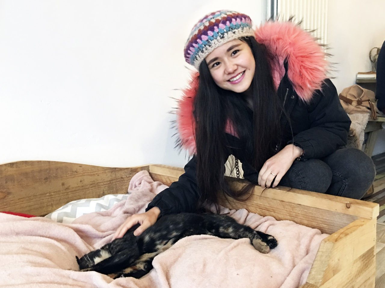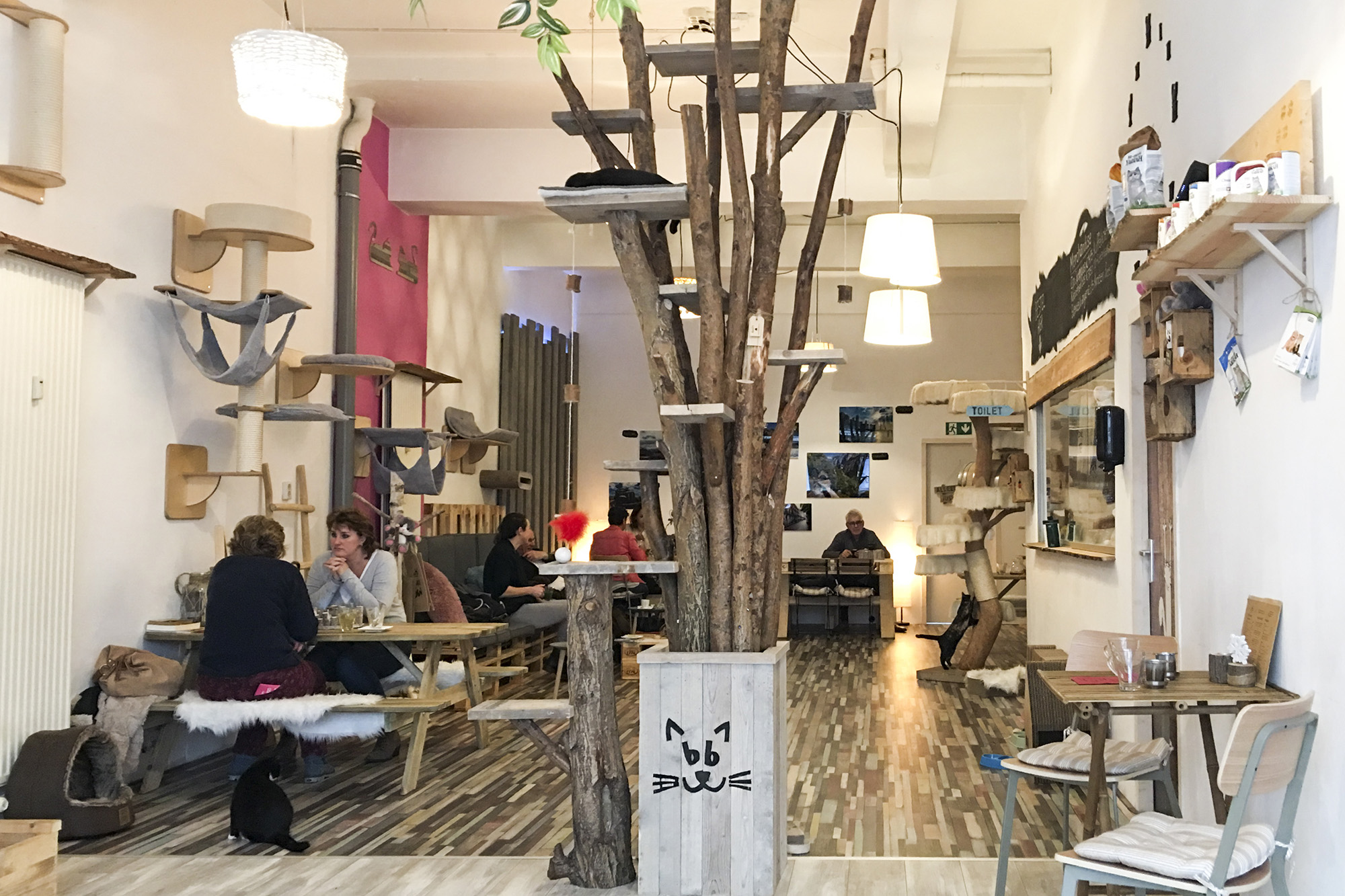 Ze geeft nog een tip: bestel cappuccino of warme chocolademelk met slagroom. Want daar komen de katten, die niet zomaar op schoot geparkeerd mogen worden, op af. Niemand weet waarom.